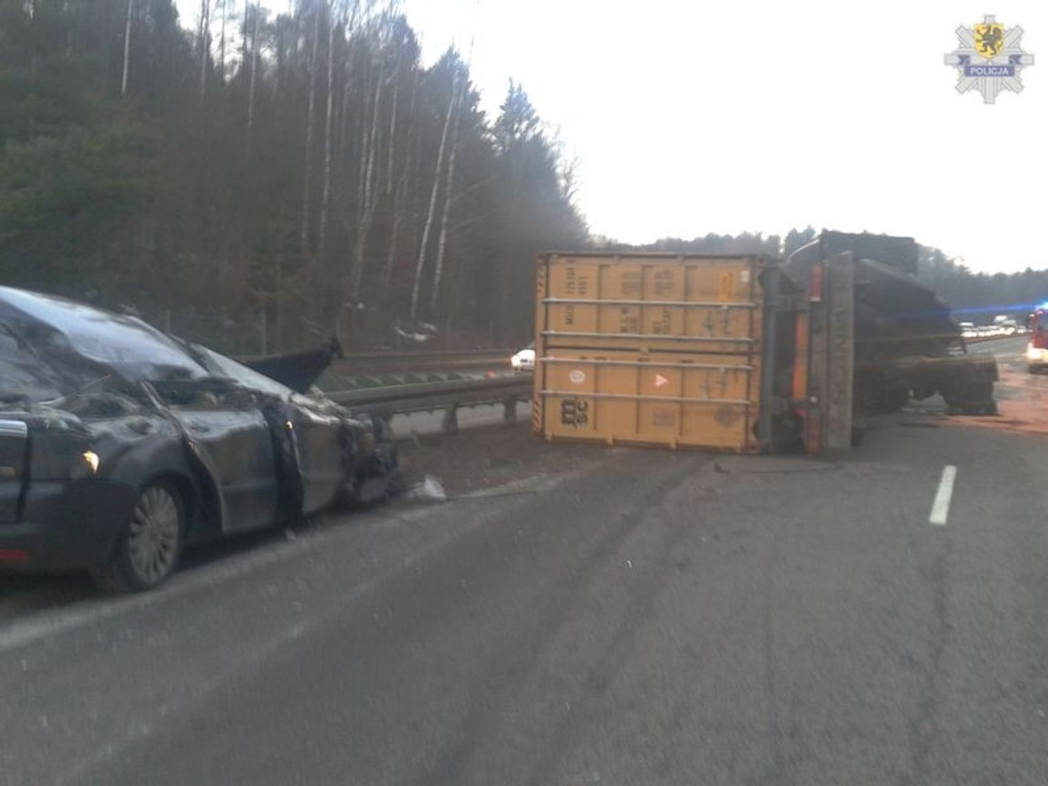 W czwartek tuż przed godziną 16.00 na Obwodnicy Trójmiasta miała miejsce groźnie wyglądająca kolizja. Ciągnik siodłowy z naczepą zmierzający w stronę Chyloni, na odcinku pomiędzy Karwinami i Chwarznem, z niepotwierdzonych przyczyn gwałtownie zahamował. W efekcie tego manewru naczepa z kontenerem przewróciła się na lewy pas ruchu, uderzając w dwa samochody osobowe. Pojazdy zostały doszczętnie zniszczone, a kierowcy i pasażer jednego z nich z niegroźnymi obrażeniami trafili do szpitala. Dwa inne samochody osobowe, które także uczestniczyły w zdarzeniu zostały lekko uszkodzone, a osobom w nich podróżującym nic się nie stało.