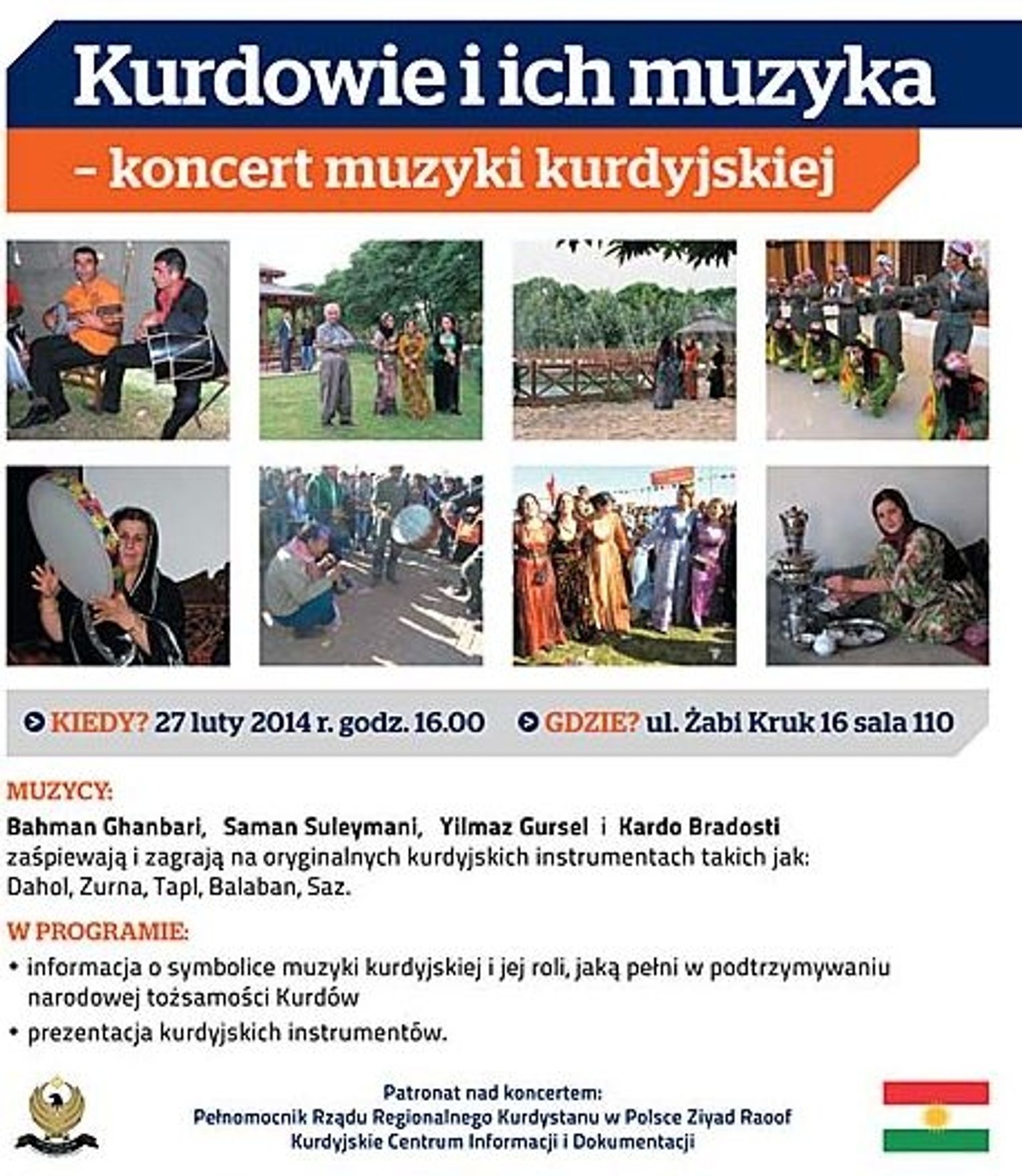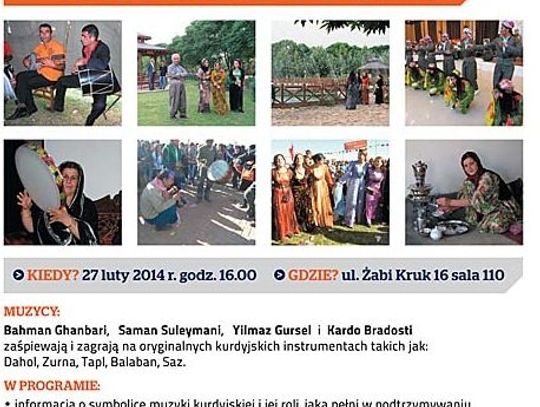 Będziemy gościć Kurdów wywodzących się z Kurdystanu irańskiego, irackiego i tureckiego, obecnie mieszkających w Skandynawii, którzy zagrają na oryginalnych kurdyjskich instrumentach dętych, perkusyjnych i strunowych. Opowiedzą też o symbolice muzyki kurdyjskiej, a także o jej roli, jaką pełni w podtrzymywaniu narodowej tożsamości.