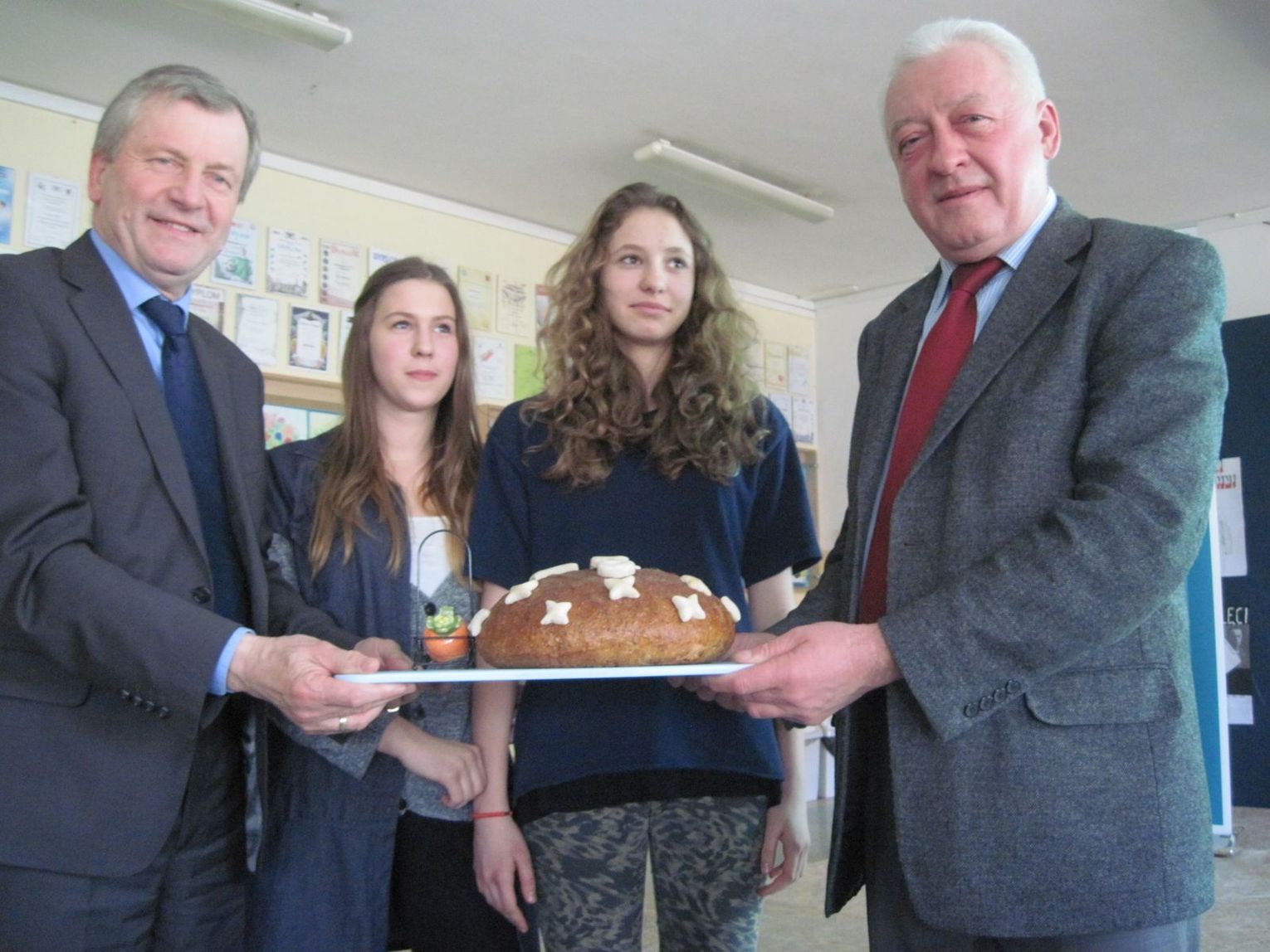 Naszymi gośćmi był Podsekretarz Stanu z Ministerstwa Administracji i Cyfryzacji Minister Bogdan Dombrowski i prof. zw. dr hab. Andrzej Stępniak - kierownik Ośrodka Badań Integracji Europejskiej na Uniwersytecie Gdańskim. Mieliśmy dużo szczęścia, bo minister Dombrowski, który na co dzień pracuje w Warszawie, pochodzi z Gdańska i przebywał tego dnia w rodzinnych stronach. Zgodził się wziąć udział w - jak sam przyznał - niecodziennym wydarzeniu. Pan profesor na miejscu pracuje z trochę starszą młodzieżą, studiującą na Uniwersytecie Gdańskim, ale dla naszych uczniów znalazł czas. Wybór gości nie był przypadkowy. Minister Dombrowski jest samorządowcem z długoletnim stażem, był też ministrem rolnictwa w 2012 r. Obecnie w ministerstwie zajmuje się współpracą z jednostkami samorządu terytorialnego z zakresu budowy sieci Internetu szerokopasmowego. Temat bardzo ciekawy, bo jak się dowiedzieliśmy, jest to jeden z większych projektów realizowanych w naszym kraju. Narodowy Plan Szerokopasmowy - bo tak się to nazywa używając oficjalnego języka, obejmuje aż czterdzieści tysięcy kilometrów sieci światłowodowej. Czytelnikom miesięcznika chcącym zgłębić temat, polecam stronę internetową ministerstwa, ale nie to jest głównym tematem tego artykułu. Ważne jest to, że prezentacja Pana Ministra doskonale wpasowała się w organizowaną lekcję wiedzy o społeczeństwie.