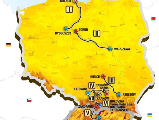 Uroczyste otwarcie 71 Tour de Pologne odbędzie się o godz. 12.40. O godz. 13.00 nastąpi start honorowy z Placu Solidarności, a o 13.20 start ostry z Traktu Św. Wojciecha. I etap wyścigu rozpoczyna się 226 kilometrową jazdą z Gdańska do Bydgoszczy. Po drodze peleton przejedzie przez Pruszcz Gd. (ok. 13.23), gdzie będzie pierwsza premia specjalna, Tczew (ok. 13.51), Malbork (ok. 14.24 - druga premia specjalna), Kwidzyn (ok. 15.17 - Lotna Premia), Grudziądz (ok. 16.00), Unisław (ok. 17.14 - Lotna Premia), Bydgoszcz (ok. 18.28 Meta I etapu).