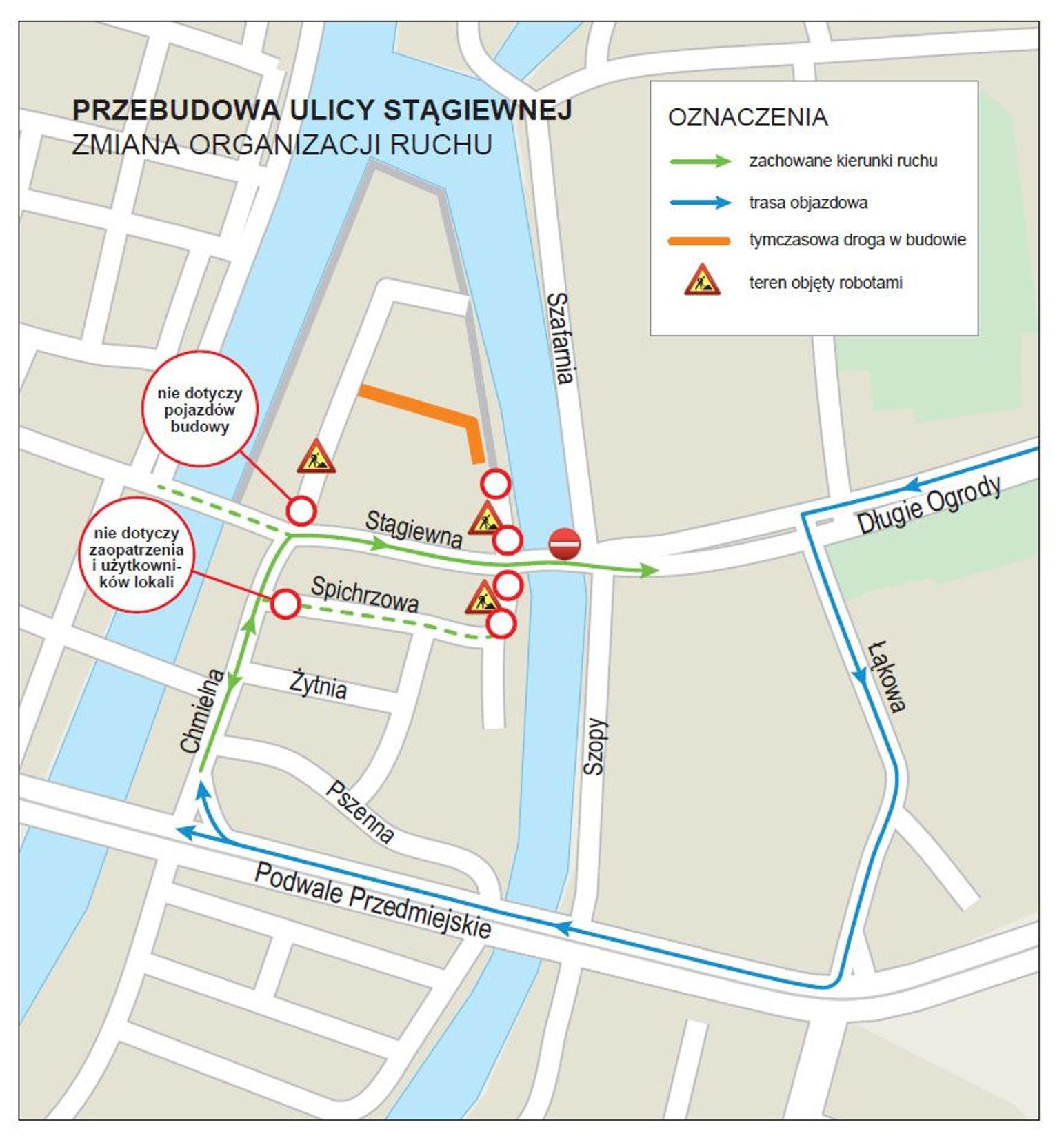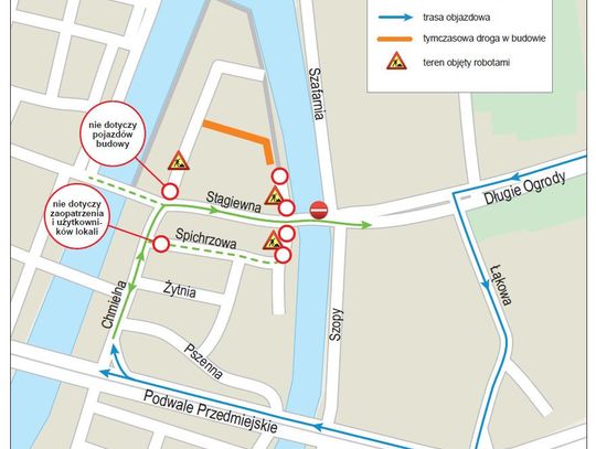 Dojazd do ul. Spichrzowej i ul. Ciesielskiej od strony ul. Długie Ogrody będzie możliwy poprzez wyznaczony objazd ul. Łąkową, ul. Podwale Przedmiejskie i ul. Chmielną.