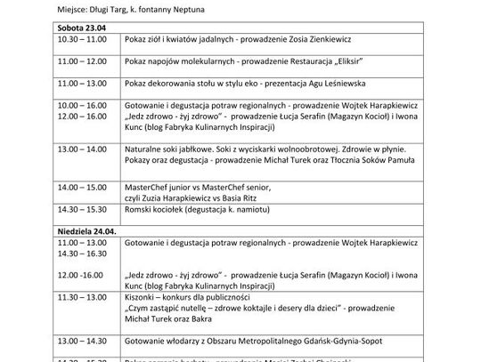 W niedzielę publiczność pozna smaki i zalety kiszonek, rodzice dowiedzą się jak przygotować zdrowe koktajle na śniadanie. Dr Małgorzata Kalemba-Dróżdż zaprezentuje tajniki dzikich roślin. Maciej Zachar Chojnacki pokaże stare metody parzenia herbat, a w sieni IKM-u prof. Andrzej Januszajtis opowie o tradycjach gdańskiej kuchni.