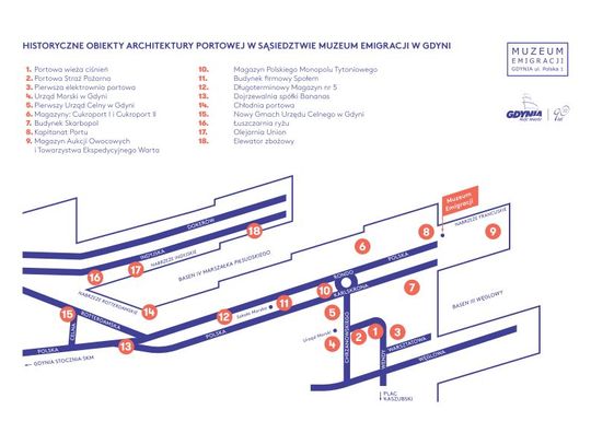 Gdyński port – od samego początku związany z emigracjami Polaków – jest równoprawnym z pracami artystów bohaterem projektu. Aby go lepiej poznać, Muzeum zaprasza na spacer architektoniczny z przewodniczką - architektką Anną Orchowską-Smolińską. To wyjątkowa okazja do zwiedzania czynnego portu, dotąd nieeksplorowanego przez szerszą publiczność. Na trasie pereł industrialnej architektury, zobaczymy najciekawsze gmachy, ale i poznamy ich dawne funkcje, przeznaczenia, tajemnice. Miłośnicy historii architektury ruszą śladami miejsc już nieistniejących, jak portowa wieża ciśnień czy Magazyn Aukcji Owocowych.