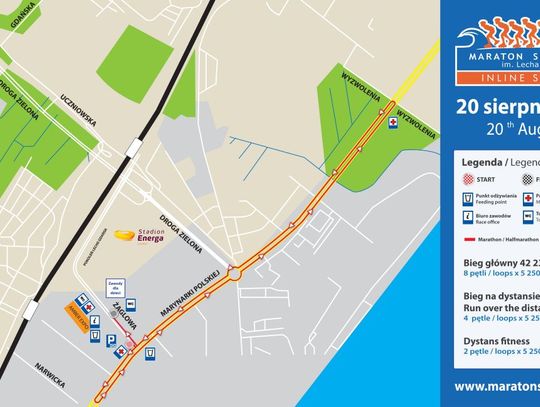 | Maraton | 42 230 m | 8 pętli x 5 250m | ul. Żaglowa | 3 h 15 min |