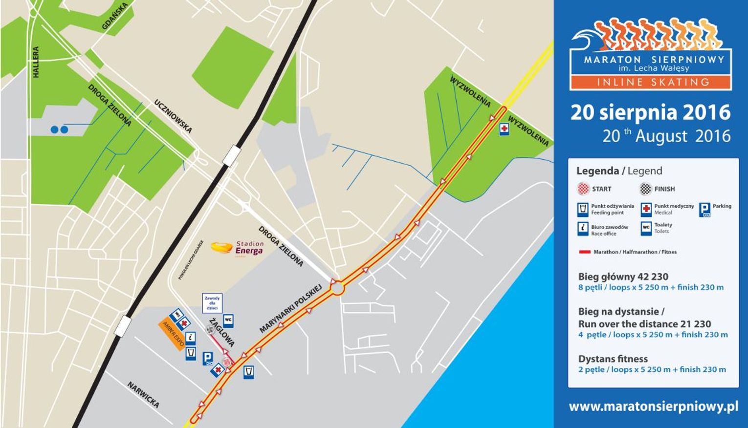 | Półmaraton | 21 230 m | 4 pętle x 5 250m | ul. Żaglowa | 3 h 15 min |