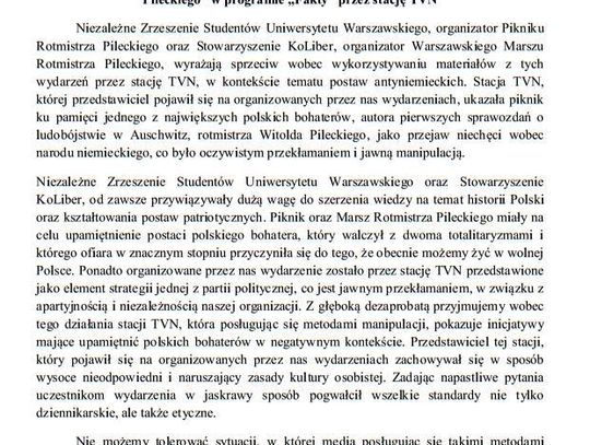 Wczoraj odbył się piknik rodzinny oraz Warszawski Marsz Rotmistrza Pileckiego. Brał udział w nich reporter TVN. I jak zrelacjonował oba wydarzania. "W wieczornym paśmie Faktów ukazały materiały z tych wydarzeń w kontekście tematu postaw antyniemieckich" - nie ukrywa oburzenia Monika Sobczak, przewodnicząca Niezależnego Zrzeszenia Studentów Uniwersytetu Warszawskiego, współorganizator wydarzenia.
