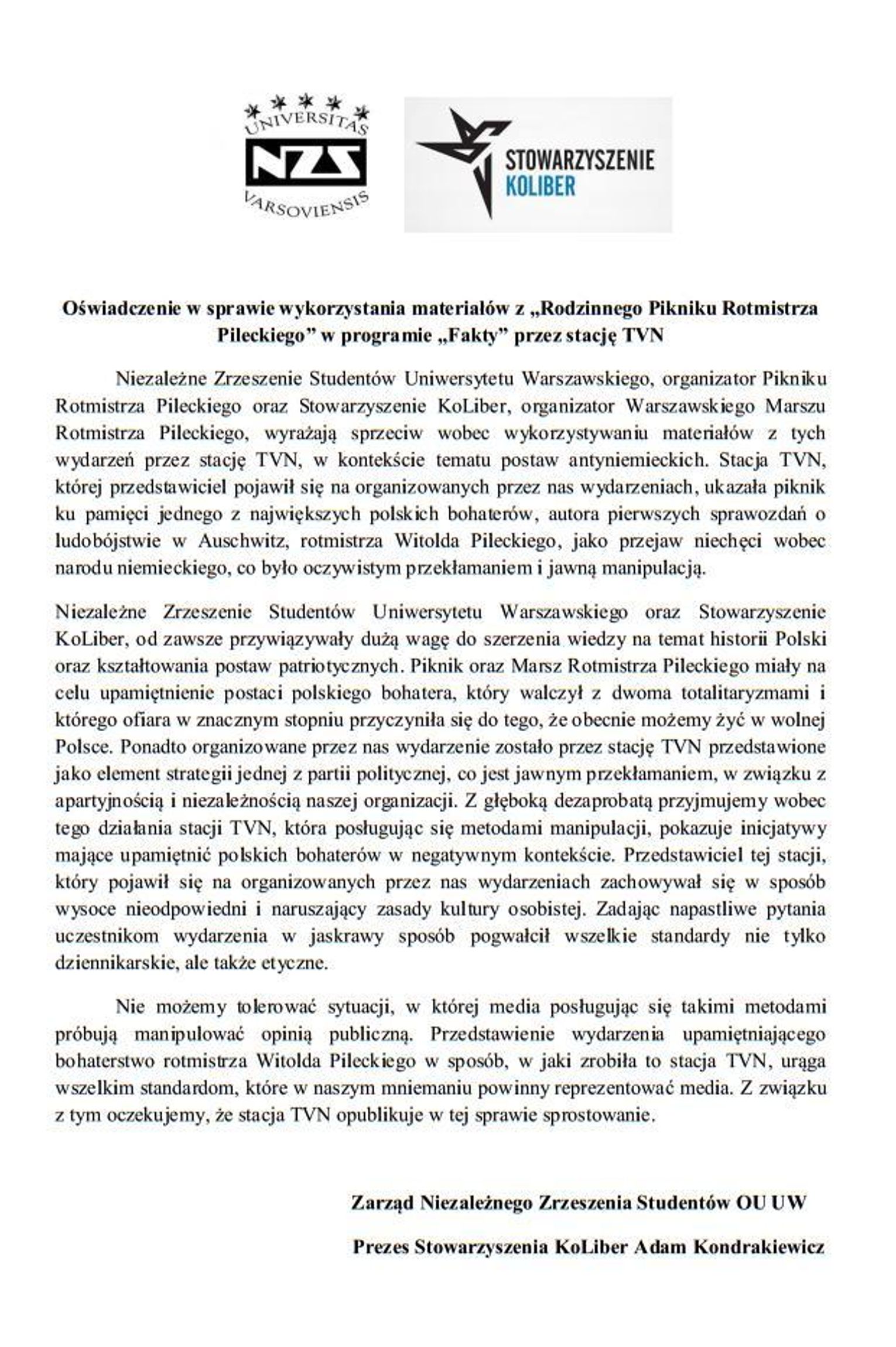 Zdaniem Sobczak ,stacja TVN, której przedstawiciel pojawił się na organizowanych przez nas wydarzeniach,"ukazała piknik ku pamięci jednego z największych polskich bohaterów, autora pierwszych sprawozdań o ludobójstwie w Auschwitz, rotmistrza Witolda Pileckiego, jako przejaw niechęci wobec narodu niemieckiego, co było oczywistym przekłamaniem i jawną manipulacją. Jednocześnie materiał sugeruje, że wczorajszy piknik i marsz wpisują się w retorykę partyjną".