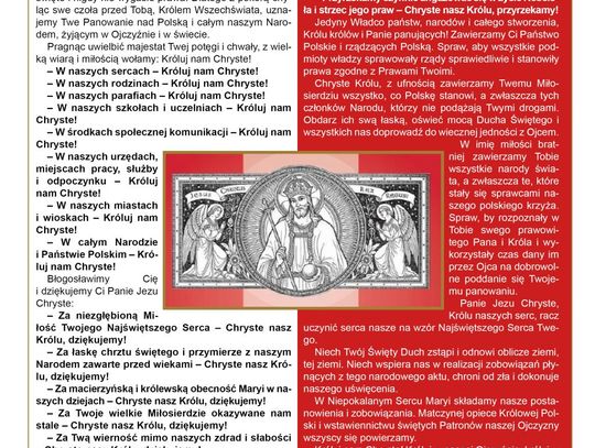 Króluj nam Chryste! Króluj w naszej Ojczyźnie, króluj w każdym narodzie – na większą chwałę Przenajświętszej Trójcy i dla zbawienia ludzi. Spraw, aby naszą Ojczyznę i świat cały objęło Twe Królestwo: królestwo prawdy i życia, królestwo świętości i łaski, królestwo sprawiedliwości, miłości i pokoju.