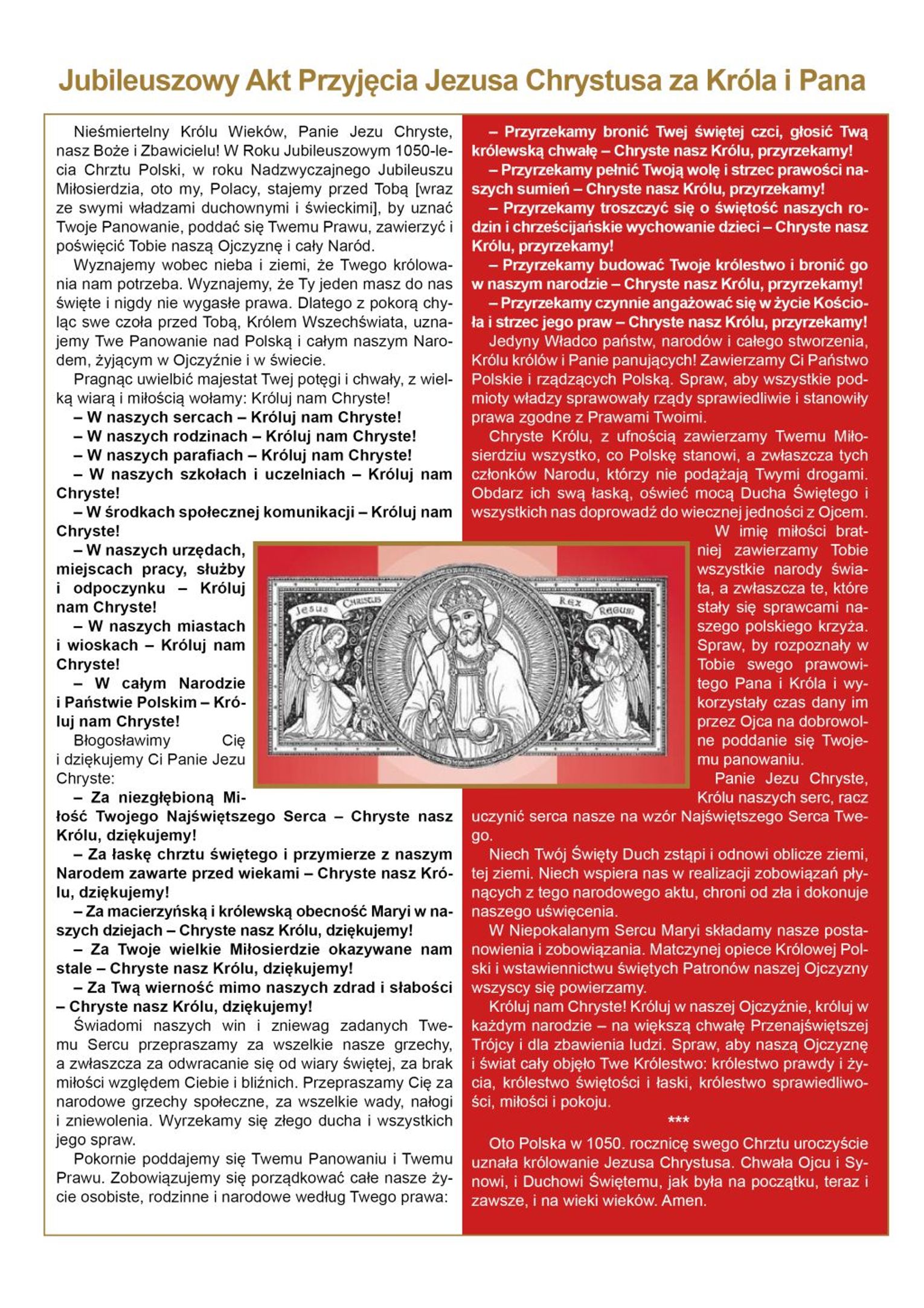 Nieśmiertelny Królu Wieków, Panie Jezu Chryste, nasz Boże i Zbawicielu! W Roku Jubileuszowym 1050-lecia Chrztu Polski, w roku Nadzwyczajnego Jubileuszu Miłosierdzia, oto my, Polacy, stajemy przed Tobą [wraz ze swymi władzami duchownymi i świeckimi], by uznać Twoje Panowanie, poddać się Twemu Prawu, zawierzyć i poświęcić Tobie naszą Ojczyznę i cały Naród.