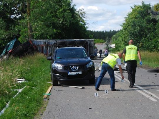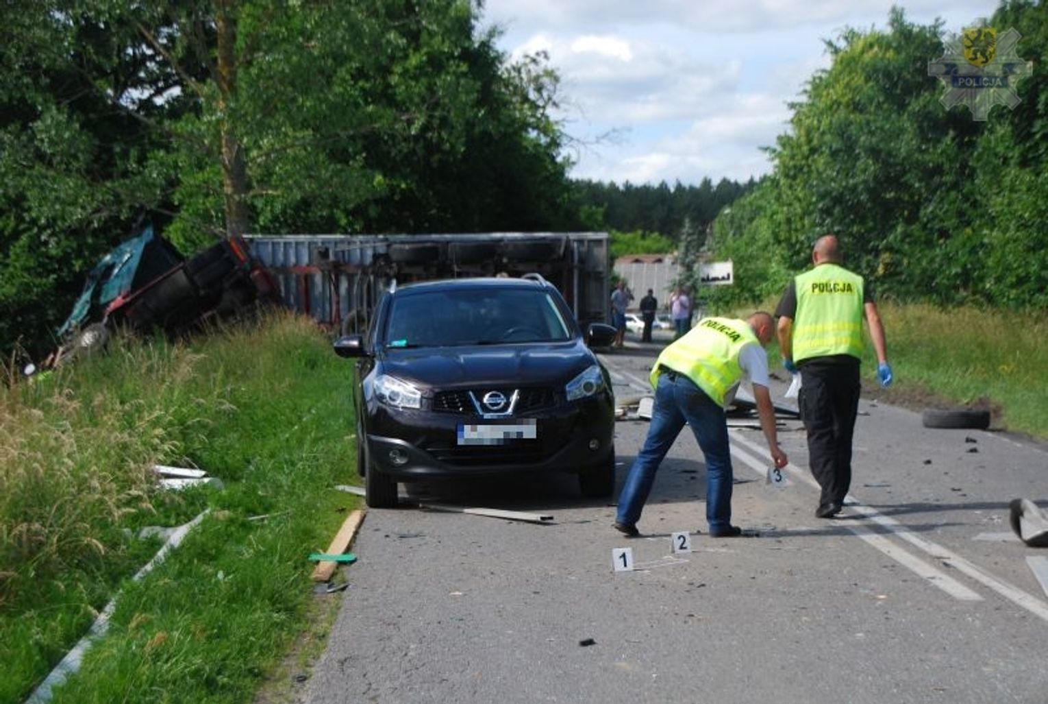 27 czerwca br.około godz. 14:00 dyżurny chojnickiej policji odebrał zgłoszenie z wojewódzkiego centrum powiadamiania ratunkowego, że na drodze wojewódzkiej 235 pomiędzy Lubnią, a Lamkiem doszło do wypadku drogowego. Przyjmujący zgłoszenie natychmiast wysłał na miejsce policjantów oraz powiadomił pozostałe służby ratownicze. Na miejscu wypadku technik kryminalistyki zabezpieczył ślady, zrobił zdjęcia oraz sporządził szkic sytuacyjny. Sprawdzono stan trzeźwości kierujących. Ze wstępnych ustaleń wynikało, że 28-letni mieszkaniec gminy Brusy jadący auto-lawetą w kierunku Chojnic z nieustalonych przyczyn zjechał na przeciwny pas ruchu wprost pod nadjeżdżający samochód ciężarowy. Kierujący ciężarowym volvem mieszkaniec powiatu kościerskiego, aby uniknąć zderzenia czołowego zjechał do prawej krawędzi jezdni, wjechał na pobocze co spowodowało, że stracił panowanie nad pojazdem, po czym zjechał na prawą stronę jezdni doprowadzając do przewrócenia pojazdu na bok i ostatecznie uderzył w przydrożne drzewo.45-letnia mieszkanka Wejherowa kierująca oplem vectrą jadąc od strony Kościerzyny zahamowała zatrzymując się przed przewracającą się naczepą, która przewróciła się na jej pojazd.