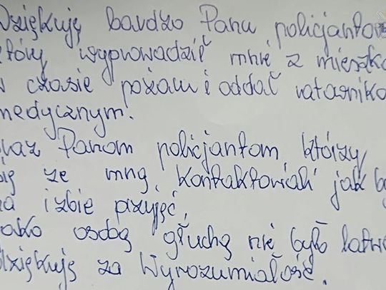 Po wejściu do mieszkania zastał ją półprzytomną, leżącą w przedpokoju. Natychmiast przez radiostację poinformował służby ratownicze, z którymi wspólnie wyprowadził z płonącego domu głuchoniemą kobietę. Poszkodowana z objawami zaczadzenia przewieziona została do słupskiego szpitala. Wczoraj osobiście tuż po wyjściu z placówki przyszła do Komendy Miejskiej Policji w Słupsku podziękować policjantowi za ocalenie życia.