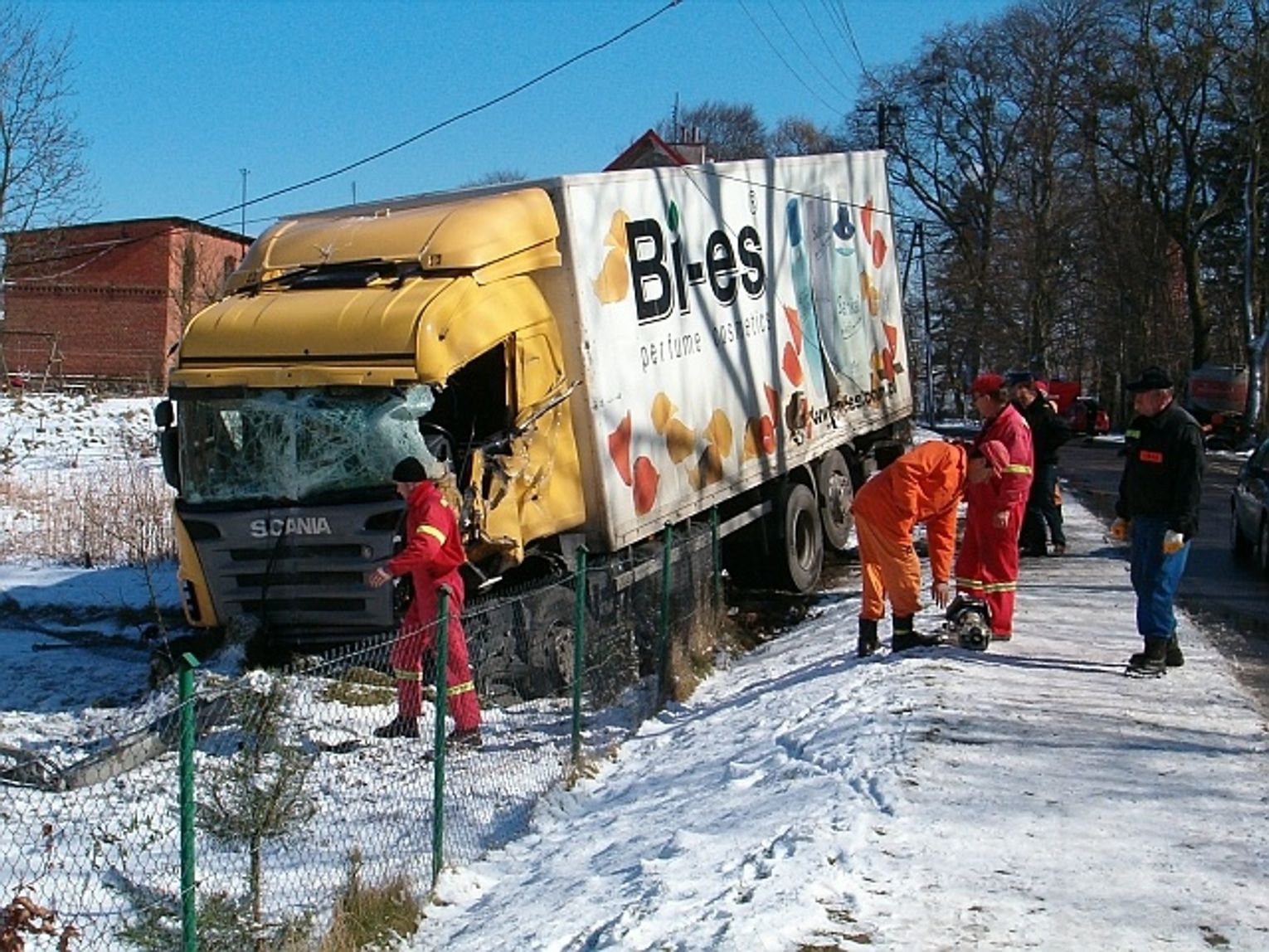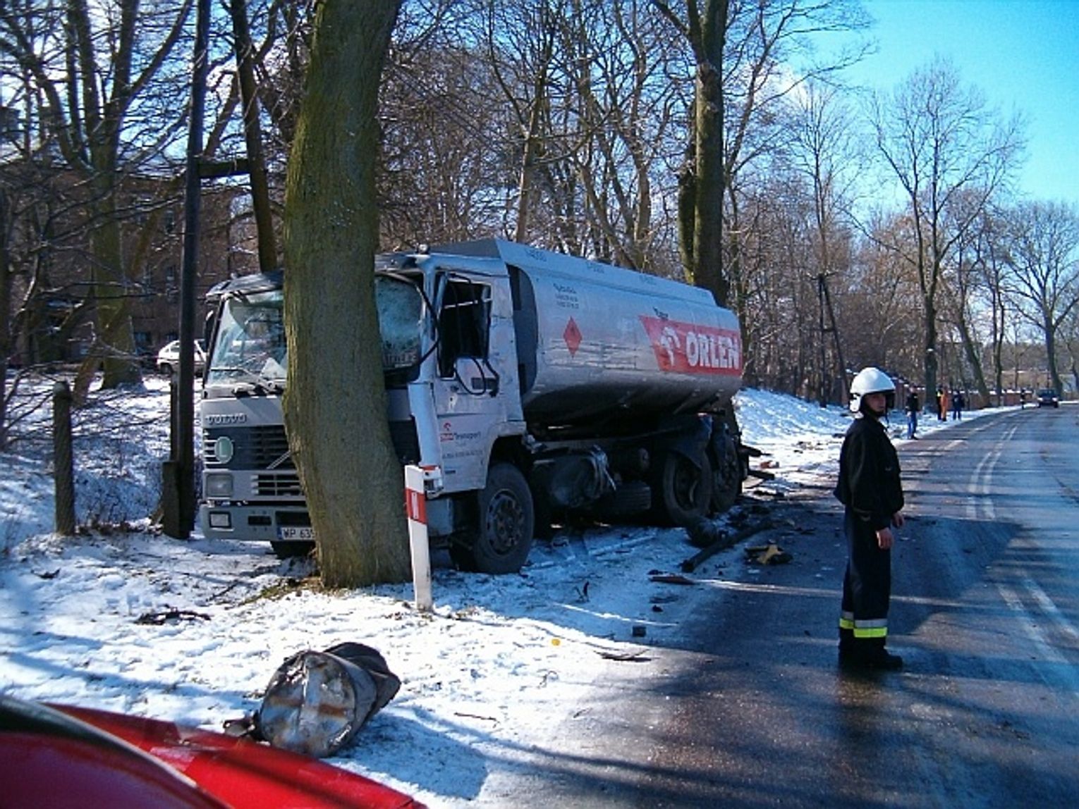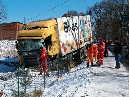 - Pojazdy zderzyły się bokiem na zakręcie naprzeciw wjazdu do szkoły - relacjonuje dyrektor Zespołu Szkół Rolniczych Centrum Kształcenia Praktycznego Alfred Portee. - Kierowcom nic się nie stało. Cysterna uderzyła w drzewo, a TIR z perfumami uderzywszy w słup energetyczny wylądował w pobliskim ogródku. Na szczęście cysterna była pusta.