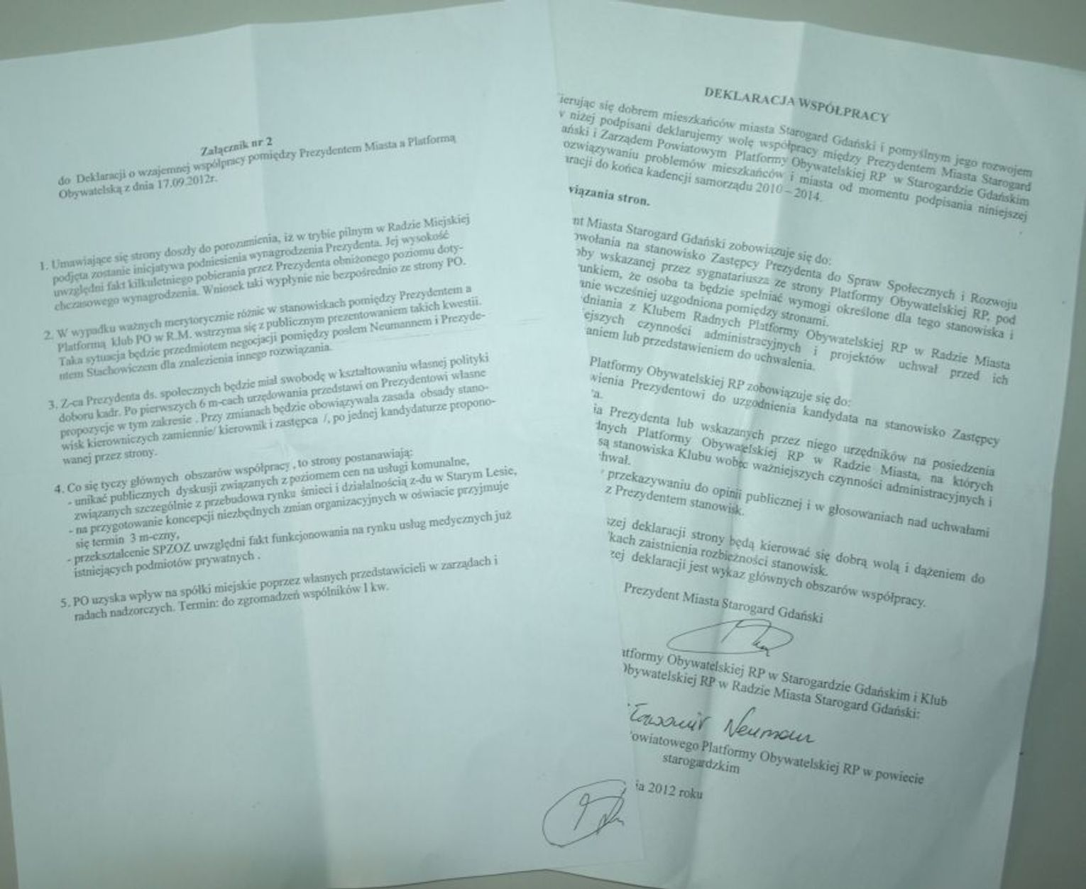 Fałszywka jest tytuowana jako „Załącznik nr 2 do Deklaracji o wzajemnej współpracy pomiędzy Prezydentem Miasta a platformą Obywatelską z dnia 17.09.2012 r.” i nawiązuje do podpisanej i opublikowanej Deklaracji zawierającej jeden załącznik. Jest sygnowana niezdarnie podrobionym moim podpisem.