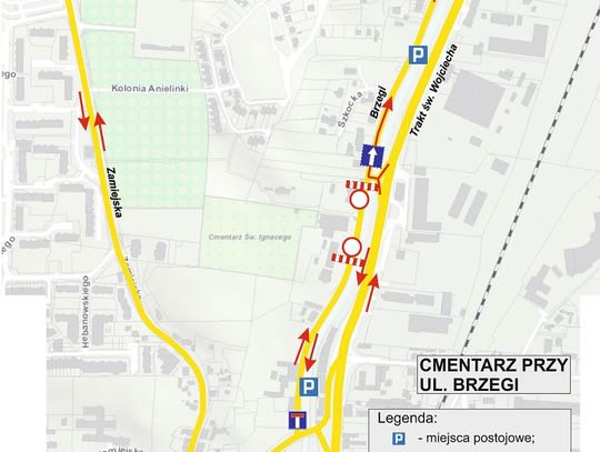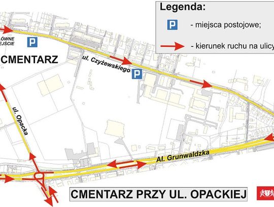- Dojazd do cmentarza jednokierunkowym wjazdem od ul. Trakt Św. Wojciecha