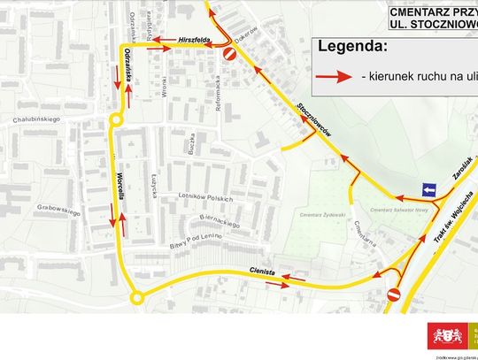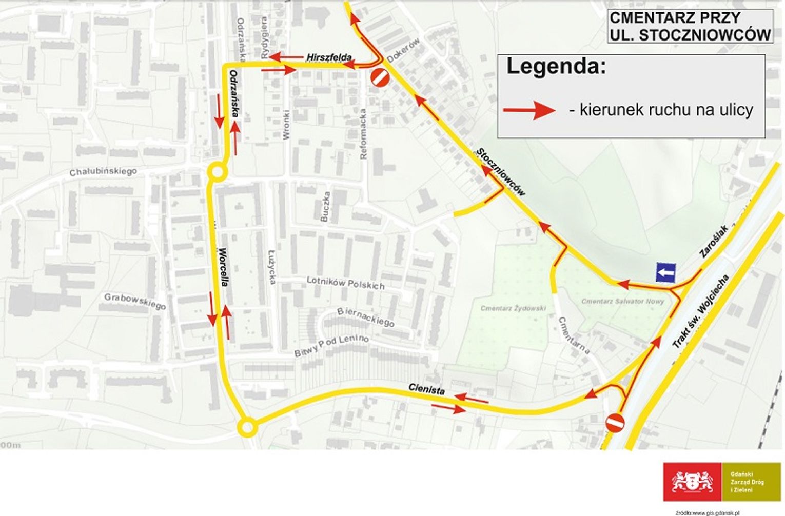- Dojazd w rejon cmentarza wyłącznie od strony ul. Marynarki Polskiej jednokierunkową ul. Wyzwolenia