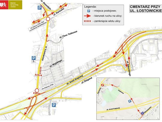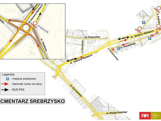 - Nie będzie możliwy wjazd pod cmentarz w ul. Srebrniki i ul. Ostrowskiej dla ruchu ogólnego.