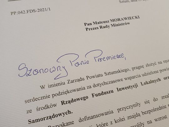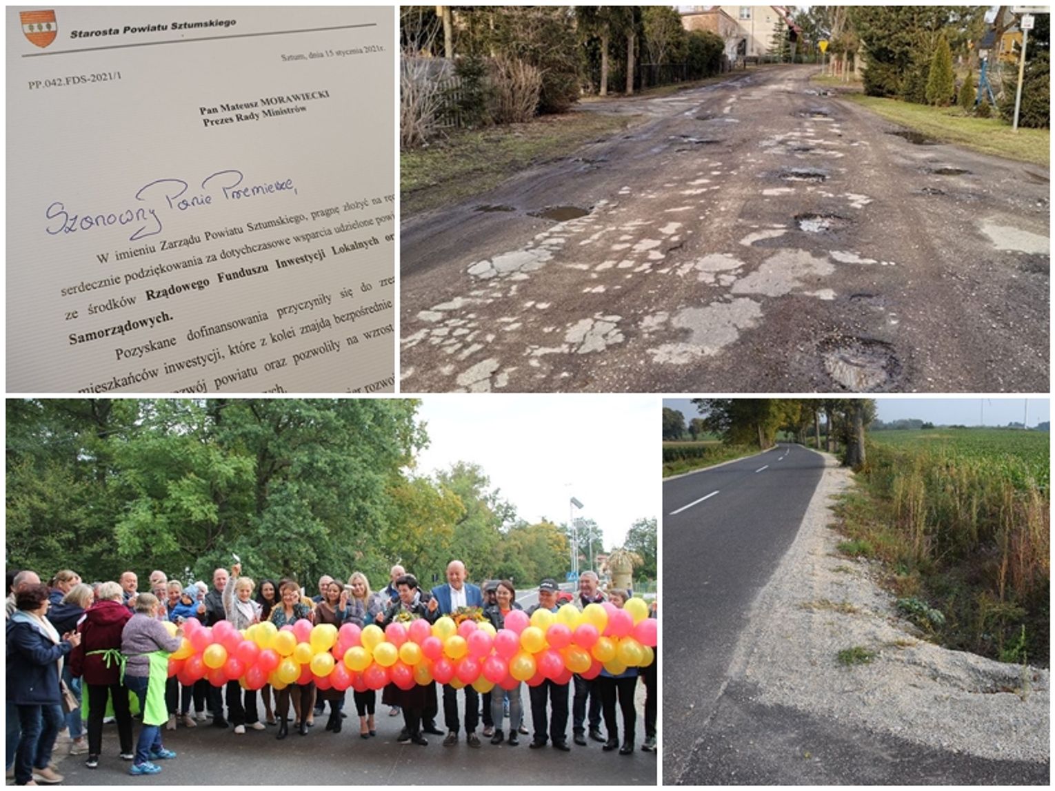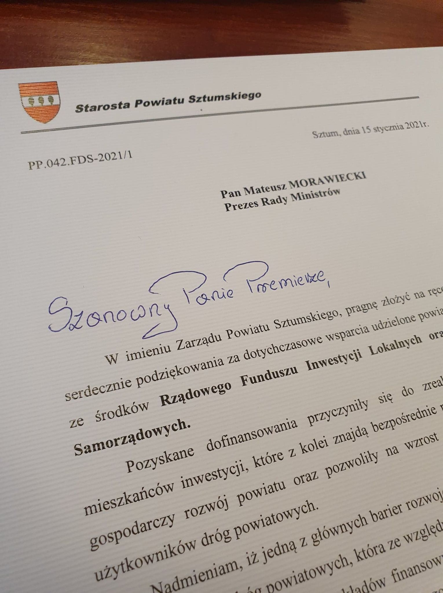- Widzieliśmy w tym odszkodowaniu także szansę na remonty naszych dróg powiatowych, bo okazało się, że mamy środki na wkład własny. Rząd w tym czasie uruchomił wiele programów związanych Funduszem Budowy Dróg Lokalnych m.in. Fundusz Dróg Samorządowych. W przypadku drogi Dzierzgoń – Żuławka Szt. postarałam się o dodatkowe dofinansowanie z budżetu państwa, z rezerwy budżetowej pisząc w tej sprawie list do premiera Mateusza Morawieckiego. Premier przychylił się do mojej prośby, przyznając powiatowi sztumskiemu blisko 10 mln zł na tydzień przed moim odwołaniem z funkcji starosty. W ramach kolejnego konkursu złożyliśmy wówczas kolejny wniosek na rzecz budowy drogi Dzierzgoń – Żuławka Szt.