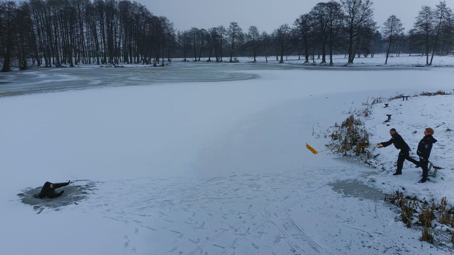 Gdy jest się świadkiem zdarzenia, w którym dochodzi do załamania się lodu pod kimś, trzeba natychmiast wezwać pomoc! Kiedy już znajdziemy się w sytuacji, w której trzeba kogoś ratować, powinniśmy podać tej osobie z brzegu jakąś tyczkę, szalik, kawałek gałęzi czy sznurka i starać się tę osobę wyciągnąć. Przede wszystkim najlepiej na lód po prostu nie wchodzić. Nie wiemy, jaka jest jego grubość. W jednym miejscu może mieć 20 centymetrów, a zaraz obok o wiele mniej, bo wypłukała go woda. Nie wiemy również, czy ktoś wcześniej nie zrobił przerębla i lód dopiero co się pojawił, a my wpadniemy w niebezpieczną pułapkę. W indywidualnych przypadkach, kiedy osoba czuje się na siłach, może podjąć ryzyko. Najlepiej czołgając się po lodzie zbliżyć się do miejsca wypadku. Nie należy podczołgiwać się pod krawędź. Trzeba ze sobą wziąć jakiś przedmiot, który następnie podamy poszkodowanemu (patyk, szal, pas, kurtkę, koło ratunkowe, drabinę). W ten sposób próbujemy go wyciągnąć. Zbliżenie się do krawędzi, grozi załamaniem, a podanie ręki wciągnięciem do wody. Jeżeli uda nam się wydostać osobę z wody, czołgając się, wracamy na brzeg. Nie zaleca się ściągania ubrań. Poszkodowanego najlepiej okryć kocem albo własną odzieżą. Do czasu przyjazdu służb można skryć się w samochodzie.