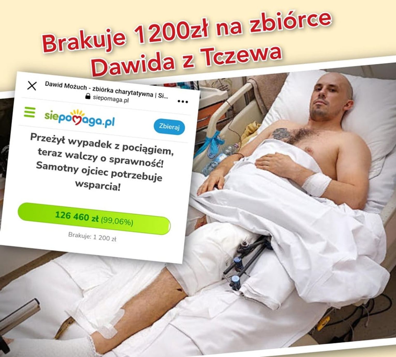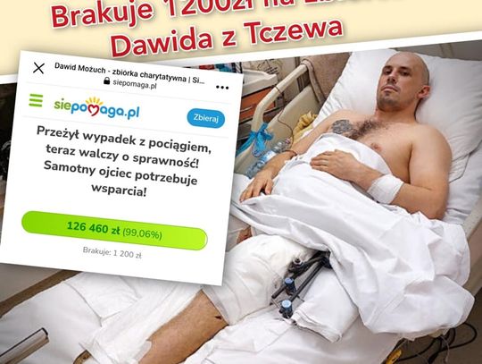 Dawid Możuch zasłabł na torowisku w Rokitkach (gm. Tczew), wysiadając. Doszło do potrącenia młodego mężczyzny, który obudził się w nowej rzeczywistości pod paru dniach. Wkrótce ruszyła zbiórka, by pomóc mu powrócić do zdrowia i pracy. Potrzebna jest nadal kosztowna rehabilitacja. Na protezę już prawie uzbierał. Obecnie nadal prowadzona jest zbiórka na Siepomaga.pl w formie skarbonek. Można wpłacać i w ten sposób pomóc panu Dawidowi powrócić do w miarę normalnego życia.