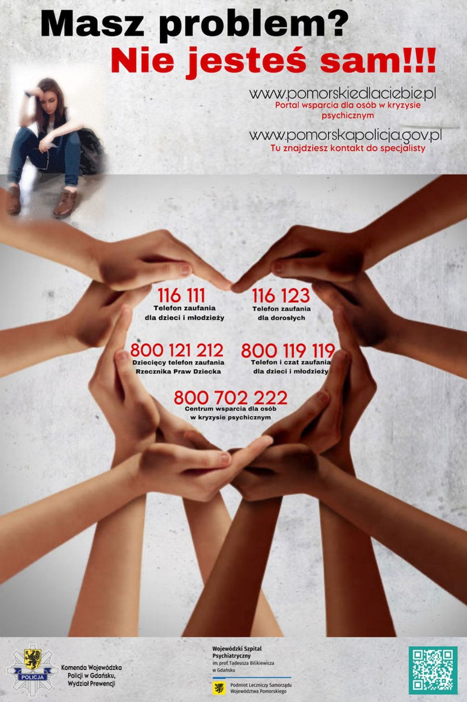 Jednym z powyższych działań było stworzenie plakatu „Masz problem? Nie jesteś sam!!!” informującego, gdzie można szukać pomocy w przypadku wystąpienia kryzysu. Znajdują się na nim numery telefonów zaufania i wsparcia dla dzieci, młodzieży i dorosłych oraz dla osób będących w kryzysie psychicznym. Na stronie www.pomorskiedlaciebie.pl, która jest portalem wsparcia dla młodych osób w kryzysie psychicznym, pomoc znajdą zarówno młode osoby, jak również nauczyciele, rodzice czy opiekunowie.