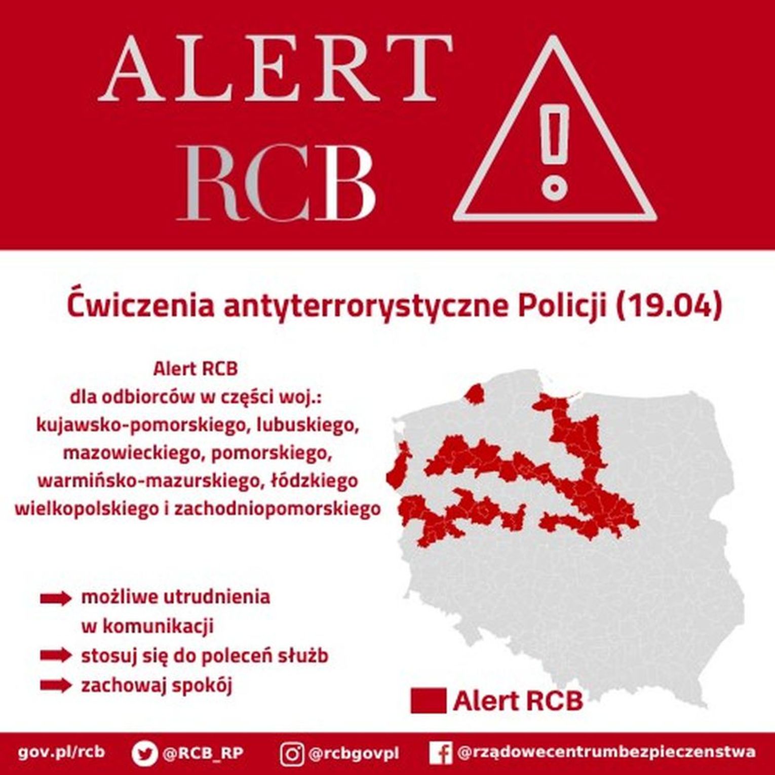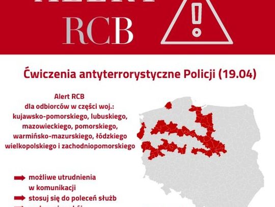 Alert RCB – to nowy SMS-owy system ostrzegania przed zagrożeniami. Centrum wskazało, że alert został wysłany do odbiorców na terenie części województwa kujawsko-pomorskiego oraz województw: lubuskiego, mazowieckiego, pomorskiego, warmińsko-mazurskiego, łódzkiego, wielkopolskiego i zachodniopomorskiego.