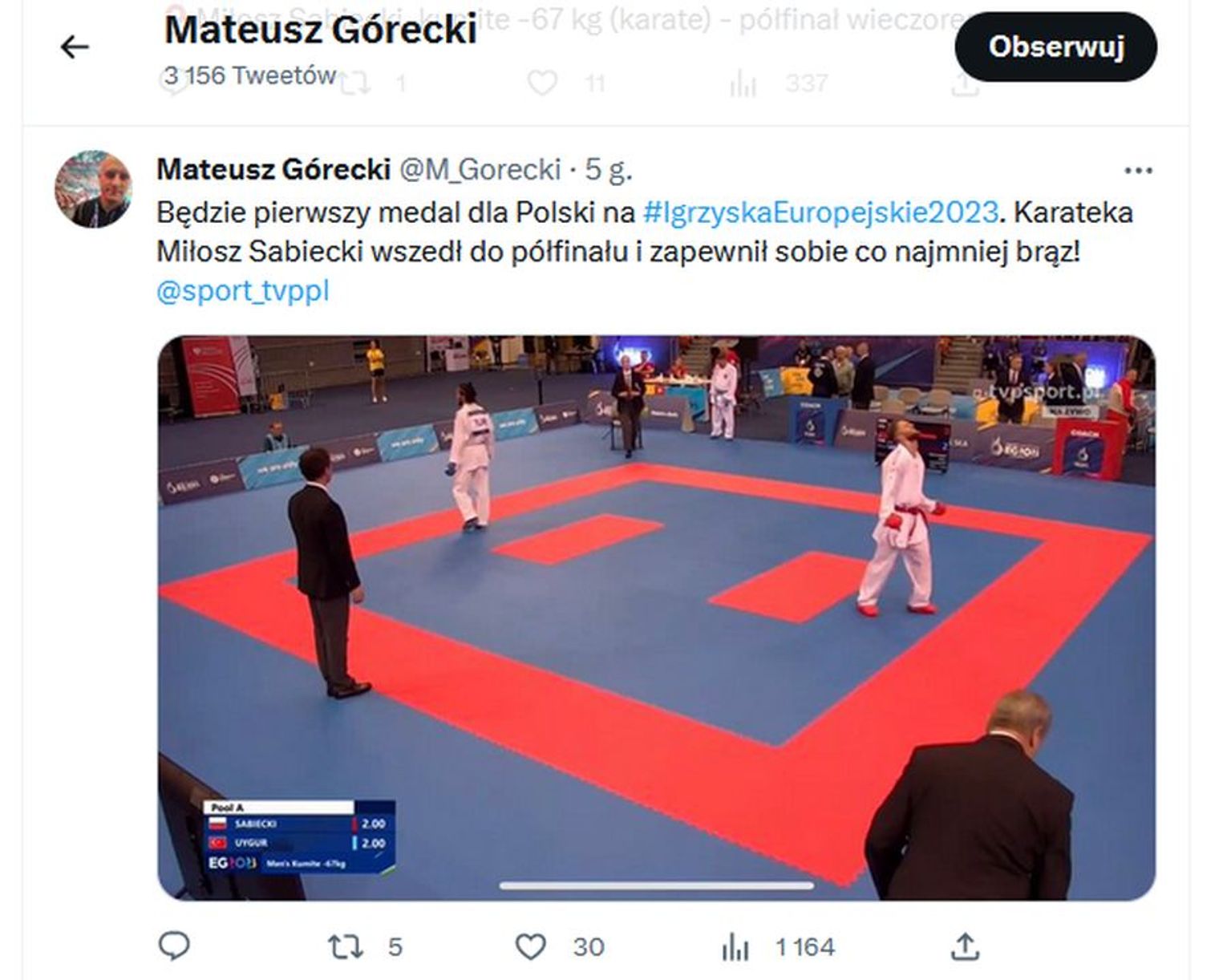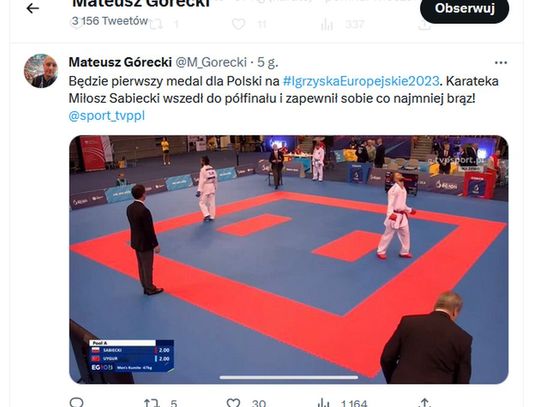 O finale Miłosza informowała już Julia Sabiecka, która wstawiła post z jego zdjęciem na Facebooka, informując że w sesji popołudniowej wywalczył on strefę medalową (dwie wygrane 8-4 z Emilem Pavlovem i Turkiem Burakiem Uygurem 3-2), jedna porażka ze Stefanem Comanescu z Rumunii 2-6.