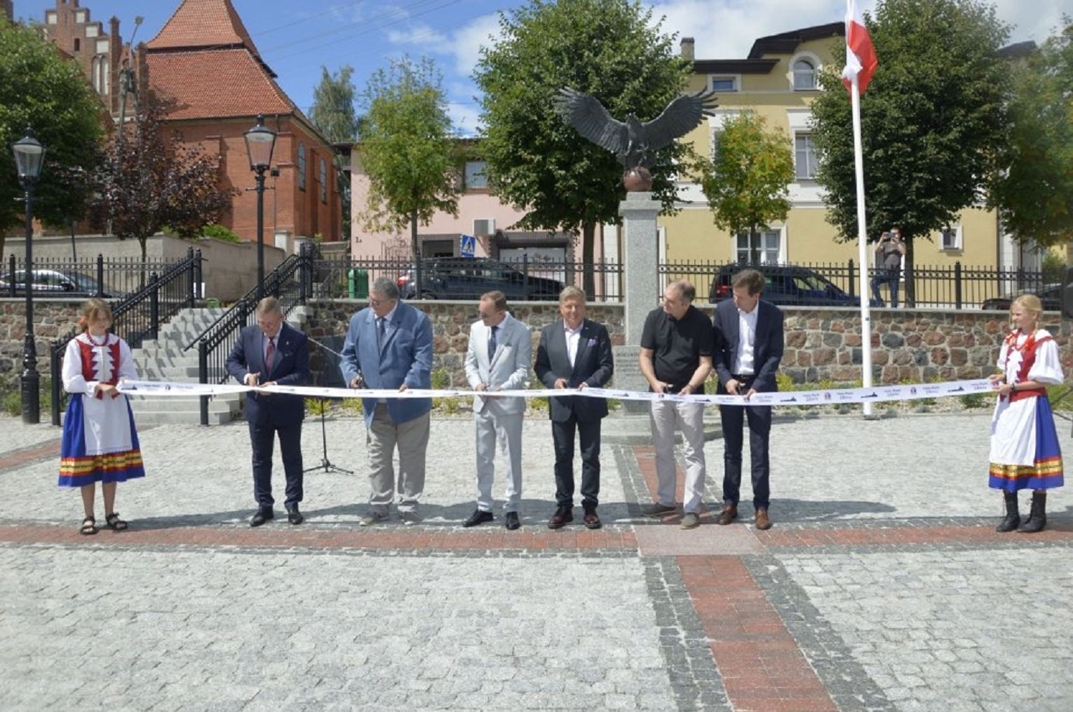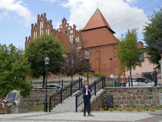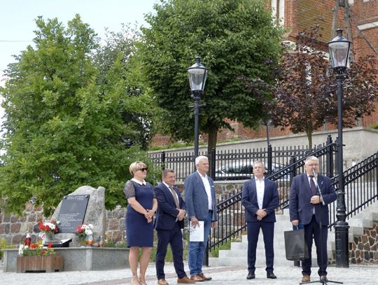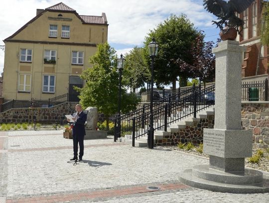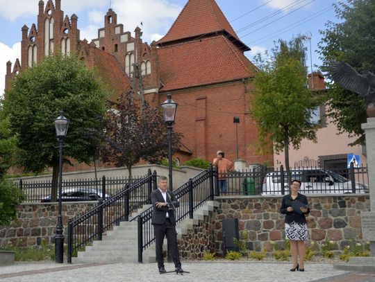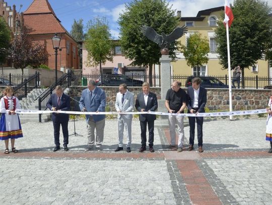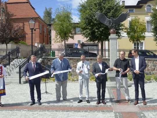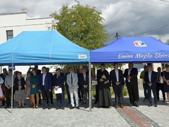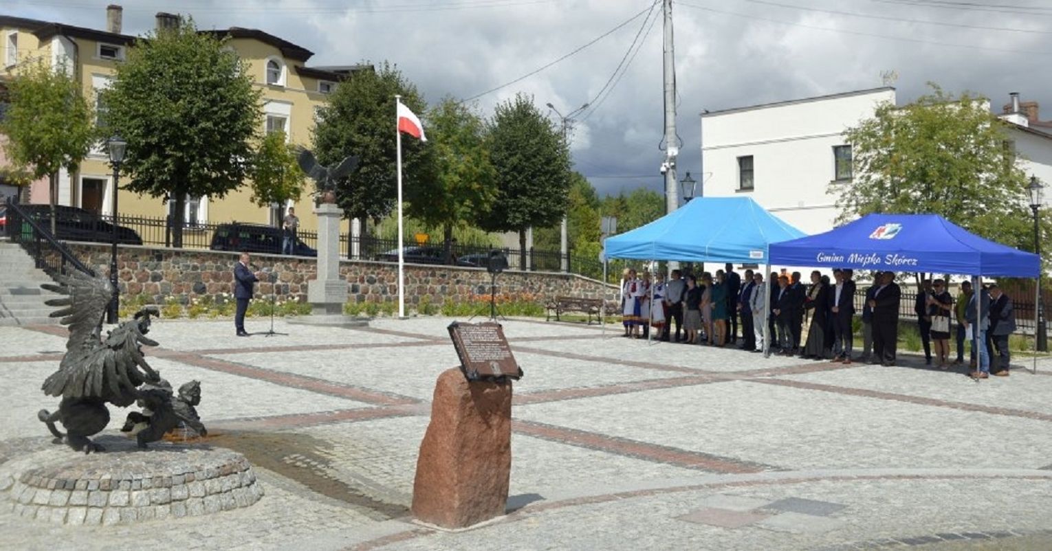 - W ramach tego zadania zrealizowaliśmy nie tylko przebudowę rynku, ale wykonaliśmy również przebudowę ciągu pieszego - po „naszamu” Tryfty – stanowiącego łącznik pomiędzy centrum miasta, a ulicą Hallera, będący dojściem do szkoły podstawowej, odrestaurowaliśmy zdrój wody artezyjskiej na ulicy Starogardzkiej, odtworzyliśmy ujęcie wody z pompą abisyńską przy ulicy 3 Maja oraz przenieśliśmy figury wykonane w latach dziewięćdziesiątych przez naszego lokalnego artystę rzeźbiarza ze zdemontowanej fontanny na Rynku do Parku Miejskiego – mówił w trakcie uroczystości Burmistrz Janusz Kosecki. - Sam rynek w tym miejscu funkcjonował w różnych konfiguracjach od lat trzydziestych XX wieku. Wcześniej, kilka wieków wstecz, jarmarki i targowiska odbywały się wzdłuż pierzei budynków okalających rynek, a obecnych ulic: Starogardzkiej, Sobieskiego i Placu Wolności. Do 1916 roku w tym miejscu funkcjonowała również szkoła katolicka w Skórczu. W 1930 roku, nasi przodkowie, na czele z Franciszkiem Schornakiem, kierownikiem szkoły i Janem Grzankowskim, ówczesnym wójtem Skórcza, postanowili ustawić na placu Rynkowym „Kamień Wolności”, który miał być gotowy na święto 3 maja. Niestety nie znamy dalszych losów tego kamienia, ale w hołdzie, oraz w dowód wdzięczności naszym przodkom, za wolną i niepodległą Ojczyznę, postanowiliśmy zbudować na zrewitalizowanym rynku pomnik Wolności i Niepodległości. Nie wiemy niestety jak wyglądał pierwotny pomnik, lecz naszym celem było oddanie ducha tamtego czasu, dlatego na pomniku umieściliśmy symbol orła w koronie zrywającego pęta, kajdany, dla którego inspiracją był symbol orła w koronie ze sztandaru Towarzystwa Powstańców i Wojaków z 1927 roku, który po dziś dzień możemy podziwiać w jednej z gablot Urzędu Miejskiego. Kolejnym elementem nawiązującym do naszej tradycji jest symbol szpaka i gryfa – zawarty w naszym herbie, a tutaj przedstawiony w motywie lokalnej legendy. Podstawą figury gryfa i szpaka jest wzniesienie nawiązujące symboliką i kształtem do grodów, które funkcjonowały na tym terenie z przepływającą obok rzeką…. Szorycą, zasilaną z jednego ze źródeł artezyjskich. Od południowej strony podstawy widoczny jest natomiast odcinek drogi wchodzącej do grodu, który symbolizuje przebiegający przez Skórcz szlak bursztynowy. Sama fontanna nawiązuje do wybijających od wieków w Skórczu źródeł artezyjskich. Wreszcie, w tym miejscu, w czasach najnowszych - w 2009 roku, spotkał się z mieszkańcami Skórcza, z okazji 75. rocznicy nadania praw miejskich miastu, Prezydent Rzeczypospolitej Polskiej Lech Kaczyński. Rok później, po tragicznej śmierci, w tym miejscu został postawiony pomnik upamiętniający wizytę Pana Prezydenta w naszym mieście – mówił Burmistrz Janusz Kosecki wyjaśniając znaczenie poszczególnych symboli znajdujących się na rynku.