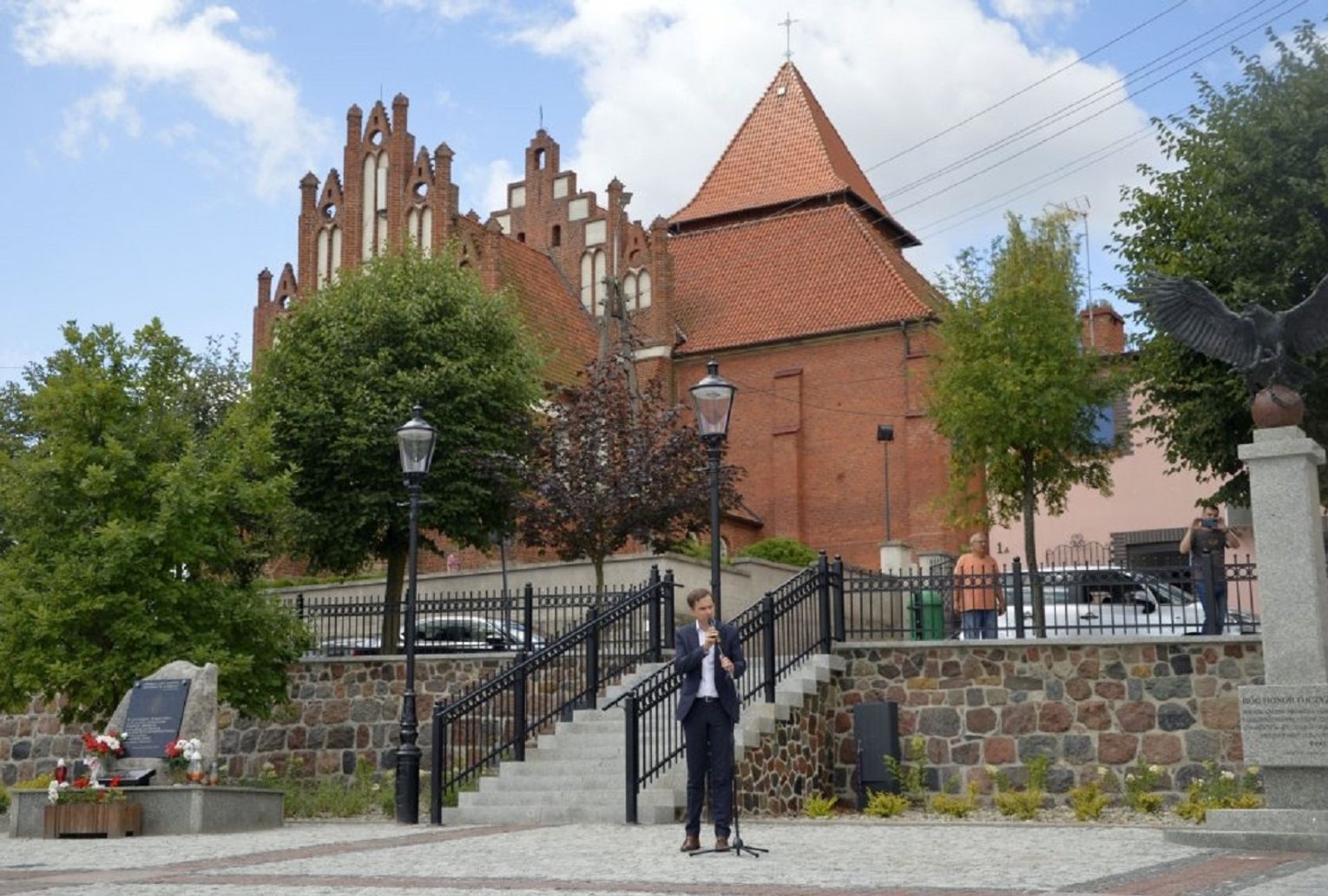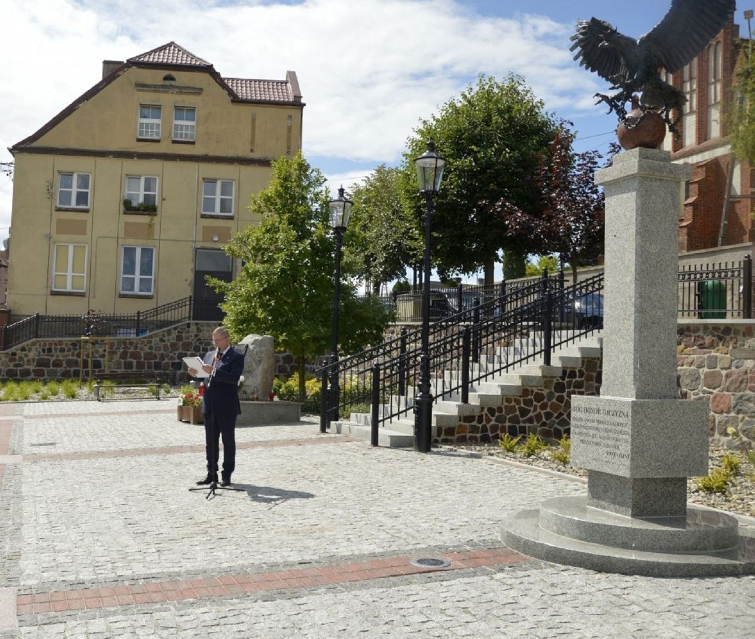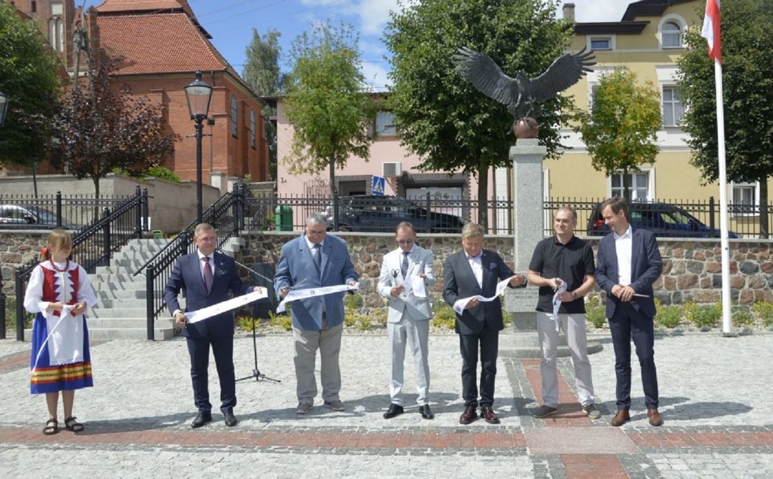 - W ramach tego zadania zrealizowaliśmy nie tylko przebudowę rynku, ale wykonaliśmy również przebudowę ciągu pieszego - po „naszamu” Tryfty – stanowiącego łącznik pomiędzy centrum miasta, a ulicą Hallera, będący dojściem do szkoły podstawowej, odrestaurowaliśmy zdrój wody artezyjskiej na ulicy Starogardzkiej, odtworzyliśmy ujęcie wody z pompą abisyńską przy ulicy 3 Maja oraz przenieśliśmy figury wykonane w latach dziewięćdziesiątych przez naszego lokalnego artystę rzeźbiarza ze zdemontowanej fontanny na Rynku do Parku Miejskiego – mówił w trakcie uroczystości Burmistrz Janusz Kosecki. - Sam rynek w tym miejscu funkcjonował w różnych konfiguracjach od lat trzydziestych XX wieku. Wcześniej, kilka wieków wstecz, jarmarki i targowiska odbywały się wzdłuż pierzei budynków okalających rynek, a obecnych ulic: Starogardzkiej, Sobieskiego i Placu Wolności. Do 1916 roku w tym miejscu funkcjonowała również szkoła katolicka w Skórczu. W 1930 roku, nasi przodkowie, na czele z Franciszkiem Schornakiem, kierownikiem szkoły i Janem Grzankowskim, ówczesnym wójtem Skórcza, postanowili ustawić na placu Rynkowym „Kamień Wolności”, który miał być gotowy na święto 3 maja. Niestety nie znamy dalszych losów tego kamienia, ale w hołdzie, oraz w dowód wdzięczności naszym przodkom, za wolną i niepodległą Ojczyznę, postanowiliśmy zbudować na zrewitalizowanym rynku pomnik Wolności i Niepodległości. Nie wiemy niestety jak wyglądał pierwotny pomnik, lecz naszym celem było oddanie ducha tamtego czasu, dlatego na pomniku umieściliśmy symbol orła w koronie zrywającego pęta, kajdany, dla którego inspiracją był symbol orła w koronie ze sztandaru Towarzystwa Powstańców i Wojaków z 1927 roku, który po dziś dzień możemy podziwiać w jednej z gablot Urzędu Miejskiego. Kolejnym elementem nawiązującym do naszej tradycji jest symbol szpaka i gryfa – zawarty w naszym herbie, a tutaj przedstawiony w motywie lokalnej legendy. Podstawą figury gryfa i szpaka jest wzniesienie nawiązujące symboliką i kształtem do grodów, które funkcjonowały na tym terenie z przepływającą obok rzeką…. Szorycą, zasilaną z jednego ze źródeł artezyjskich. Od południowej strony podstawy widoczny jest natomiast odcinek drogi wchodzącej do grodu, który symbolizuje przebiegający przez Skórcz szlak bursztynowy. Sama fontanna nawiązuje do wybijających od wieków w Skórczu źródeł artezyjskich. Wreszcie, w tym miejscu, w czasach najnowszych - w 2009 roku, spotkał się z mieszkańcami Skórcza, z okazji 75. rocznicy nadania praw miejskich miastu, Prezydent Rzeczypospolitej Polskiej Lech Kaczyński. Rok później, po tragicznej śmierci, w tym miejscu został postawiony pomnik upamiętniający wizytę Pana Prezydenta w naszym mieście – mówił Burmistrz Janusz Kosecki wyjaśniając znaczenie poszczególnych symboli znajdujących się na rynku.