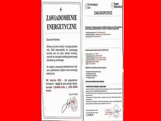 Ku przestrodze publikujemy „Zawiadomienie energetyczne”, jakie otrzymali mieszkańcy Mińska Mazowieckiego. Zwracamy uwagę, że zawiera ono nieprawdziwe informacje również co do wysokości cen energii w 2024 r. Prezes URE, odpowiedzialny za weryfikację i zatwierdzanie ustalonych przez przedsiębiorstwa energetyczne taryf dla gospodarstw domowych, decyzję o zatwierdzeniu taryf na 2024 r. będzie podejmował pod koniec bieżącego roku. Wnioski taryfowe od największych sprzedawców energii na 2024 r. jeszcze nie wpłynęły do Urzędu. Stąd informacja dotycząca cen energii w 2024 roku jest nieprawdziwa.