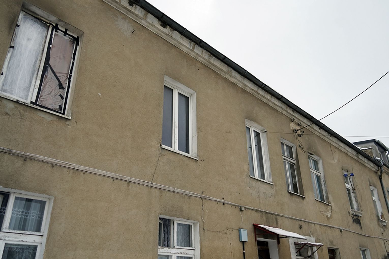 Mieszkanie po pożarze sąsiedzi zabili deskami, by nikt postronny tam już nie wszedł. Po akcji jedno mieszkanie uległo zalaniu. Po pożarze widać jeszcze osmolone okna i firany... Całość wygląda przygnębiająco, biednie...