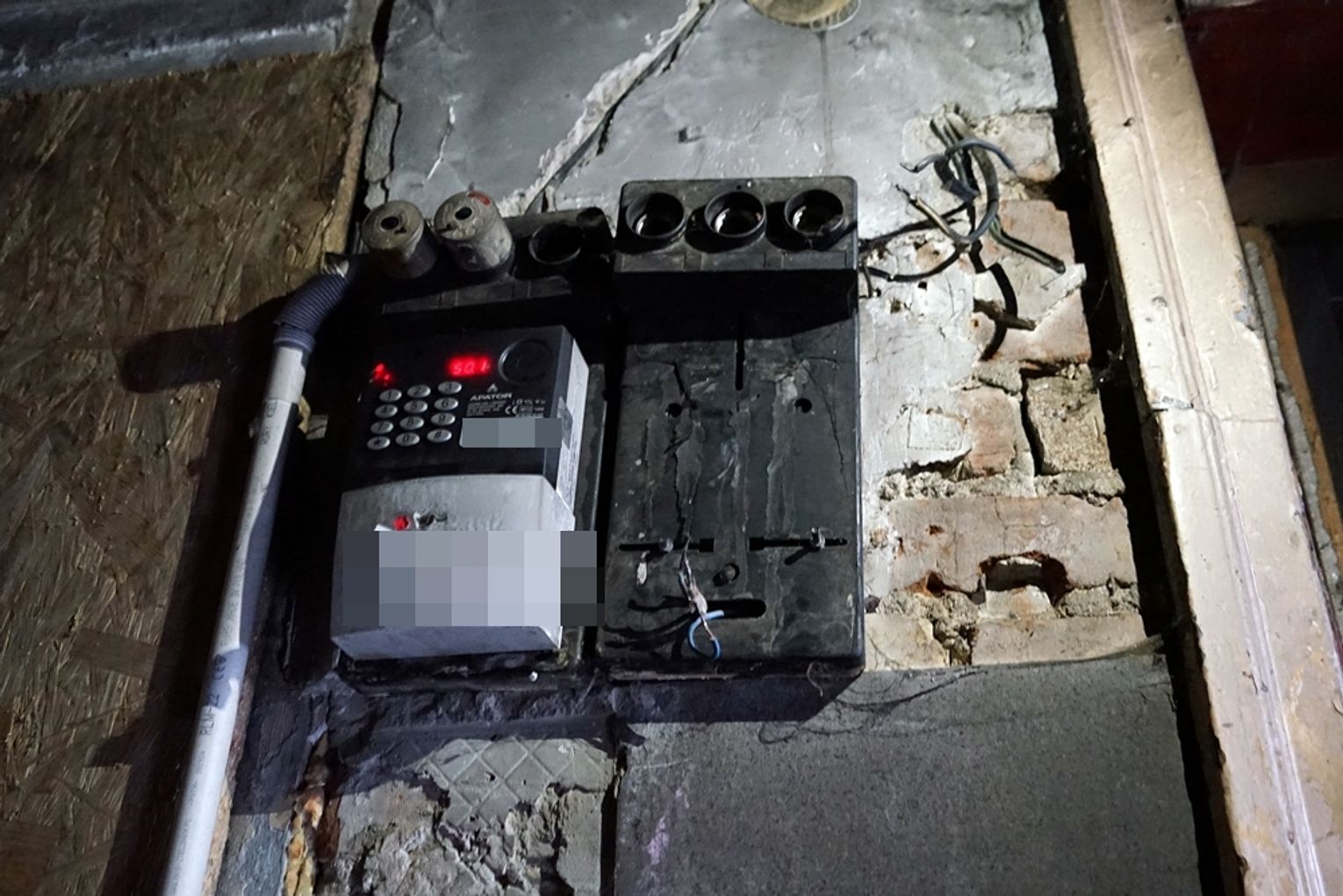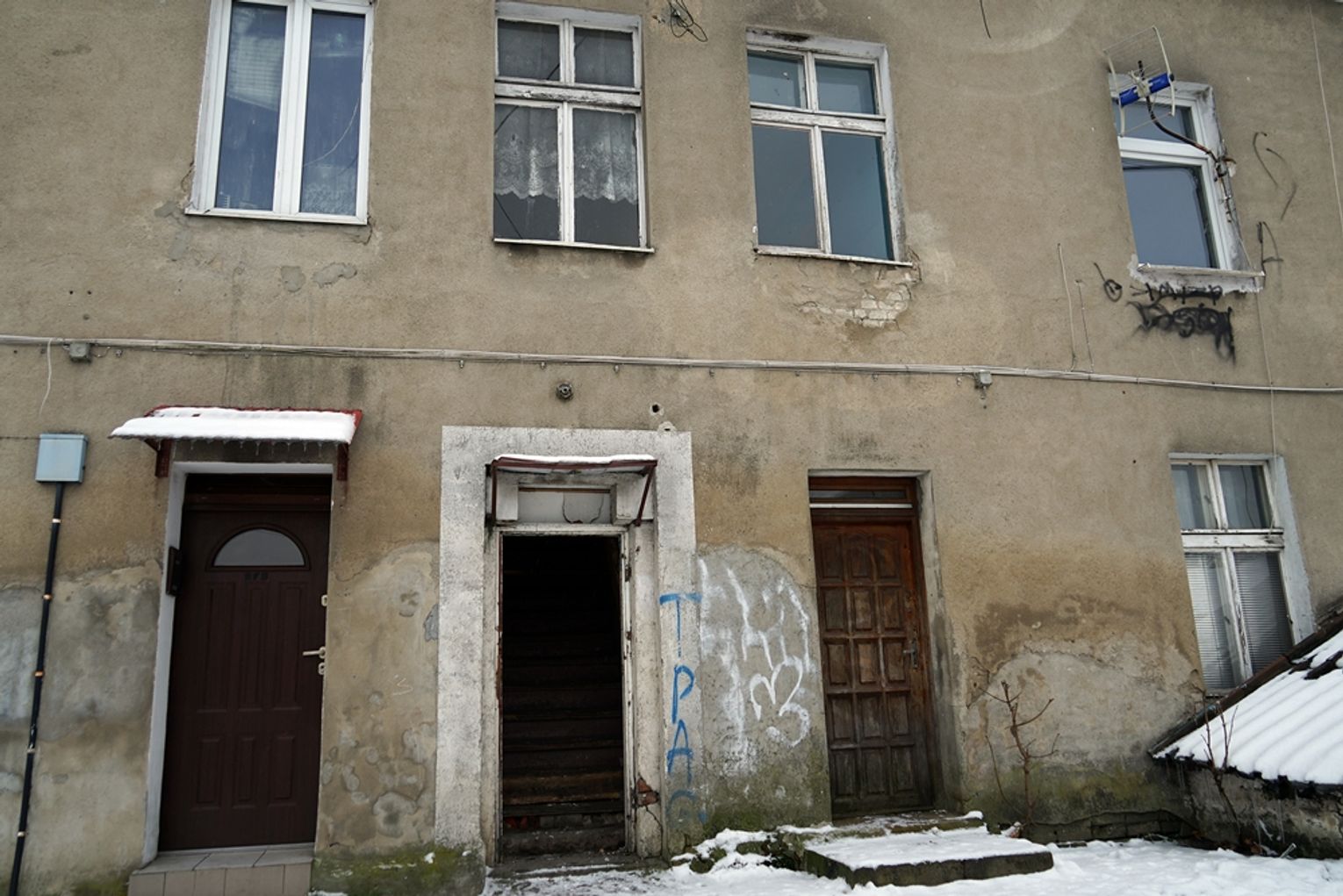 Stan kamienicy po drugiej stronie budynku jest jeszcze gorszy niż od strony starostwa. Drewaniania klatka schodowa prowadząca do pustostanu jest brudna i zdewastowana. Na piętro prowadzą drewniane czarne od brudu schody. Po bokach przykrego klimatu dopełniały dwa zdemontowane liczniki na prąd, z których zwisały kable...