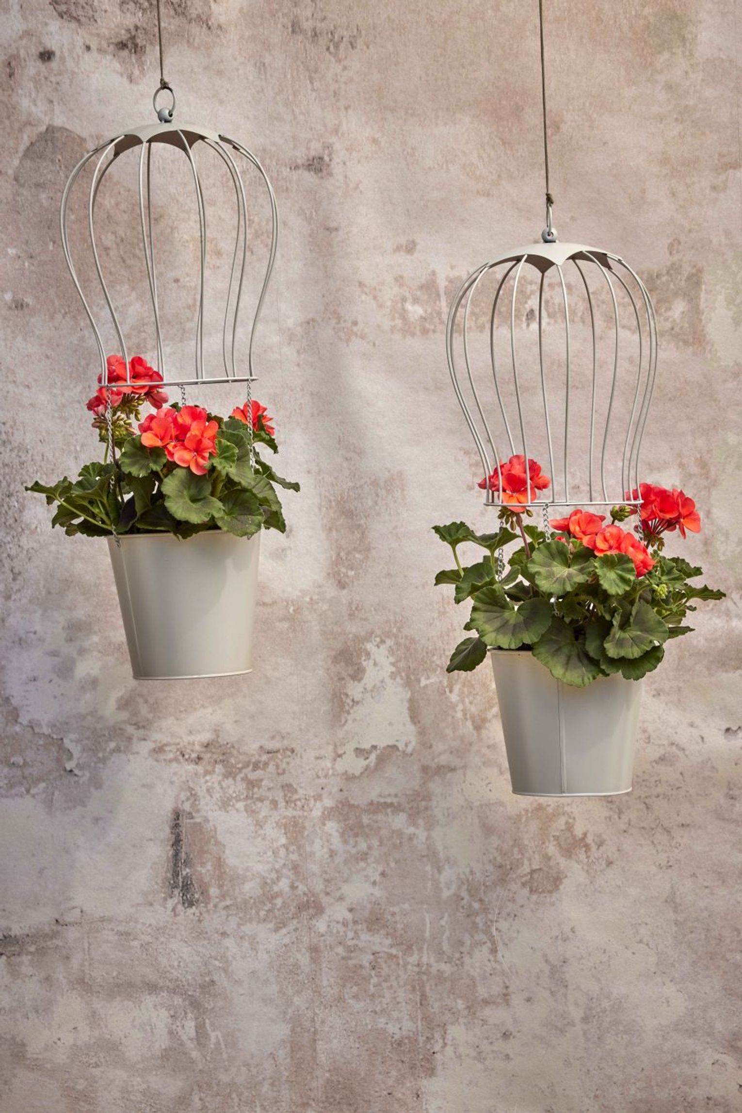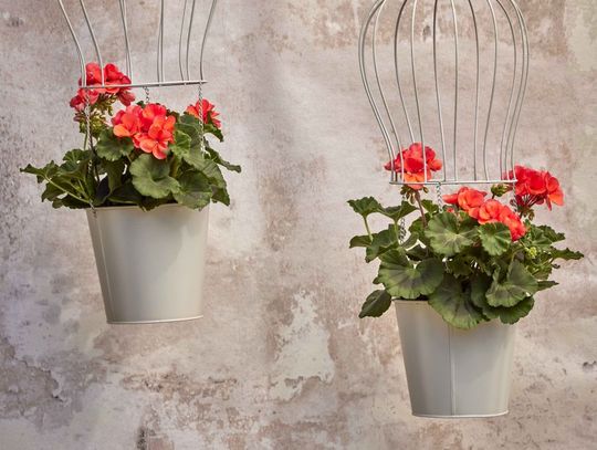 kilka mniejszych wazonów wypełnionych kolorowymi pelargoniami. Na przykład, w mgnieniu oka możesz stworzyć tę kwiatową rozkosz na efektownej etażerce w stylu vintage. Zardzewiały metal jej tekstury ciekawie kontrastuje z żywymi kwiatami. Ozdobne liście pelargonii i pękate wazony w rustykalnych kolorach dobrze się tu sprawdzają.