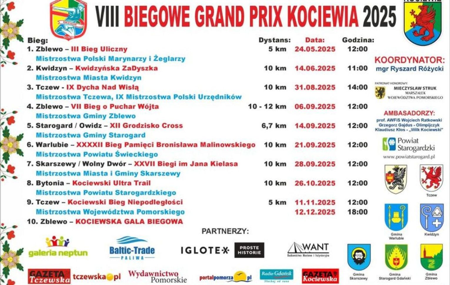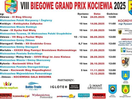 Po długich spotkaniach i planowaniu u organizatorów biegów udało się wypracować kalendarz nowego cyklu VIII Biegowe Grand Prix Kociewia 2025, nad którym Gazeta Tczewska, portal – Tczewska.pl wspólnie z Gazetą Kociewską i portalem – Kociewiak.pl obejmują patronat medialny.