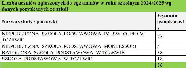Ze względu na przeprowadzoną reformę edukacji w 2017 r. i całkowite wygaśnięcie gimnazjum, które zostały przekształcone w szkoły podstawowe: Gimnazjum nr 1 w Szkołę Podstawową nr 1 i Gimnazjum nr 3 w Szkołę Podstawową nr 4, w tych dwóch placówkach w roku szkolnym 2024/2025 w Tczewie egzamin ósmoklasisty zostanie przeprowadzony po raz pierwszy.