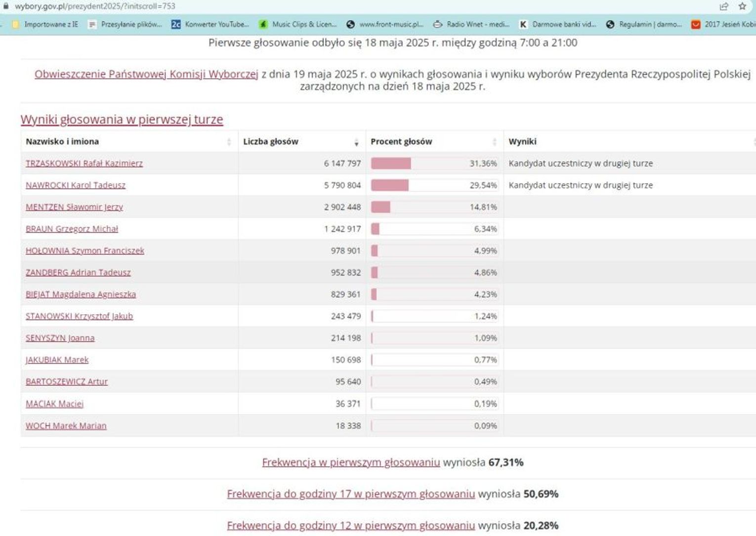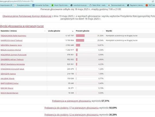 Zupełnym zaskoczeniem był wysoki wynik Grzegorza Brauna 6,34 proc. poparcia z 1 242 917 głosami wyborców. Jak pisze „Rzeczpospolita”: „sondaże exit poll i late poll wskazywały, że Zandberg ma lepszy wynik niż Hołownia, co jednak się nie potwierdziło”. Cała reszta pretendentów do najwyższego urzędu, a zatem: Magdalena Biejat, Joanna Senyszyn, Krzysztof Stanowski, Marek Jakubiak, Artur Bartoszewicz, Maciej Maciak, Marek Woch – osiągnęli słabsze wyniki. Szkoda, że ekonomista A. Bartoszewicz nie zdobył dużego poparcia, a Marek Jakubiak tylko 150 698 głosów (0,77 proc.) bombardowany przez mainstreamowe media obelgami typu populista i prawicowiec. Tymczasem prezentował zdrowe (realne) podejście do gospodarki. Polacy nie dali się porwać dr. Markowi Woch, popieranemu przez środowisko Bezpartyjnych Samorządowców. Natomiast polscy wyborcy są uodpornieni na populizm i straszenie Rosją w stylu Macieja Maciaka 0,19 proc. przy 36,371 głosach. Szkoda, że i te ponad 30 tysięcy osób dało się oszukać propagandowym, prorosyjskim tekstom w bolszewickim stylu.