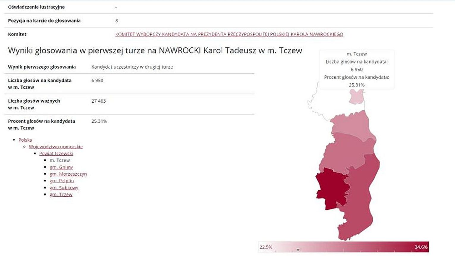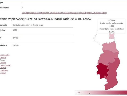 W powiecie tczewskim podobnie jak w całym województwie pomorskim wygrali kandydaci – faworyci 33,54 proc. dla R. Trzaskowskiego (17 499), jednak ze stosunkowo niewielką różnicą I turę przegrał Karol Nawrocki, uzyskując 26,49 proc. poparcia społecznego przy ważnej liczbie 13 822 głosów na kandydata.