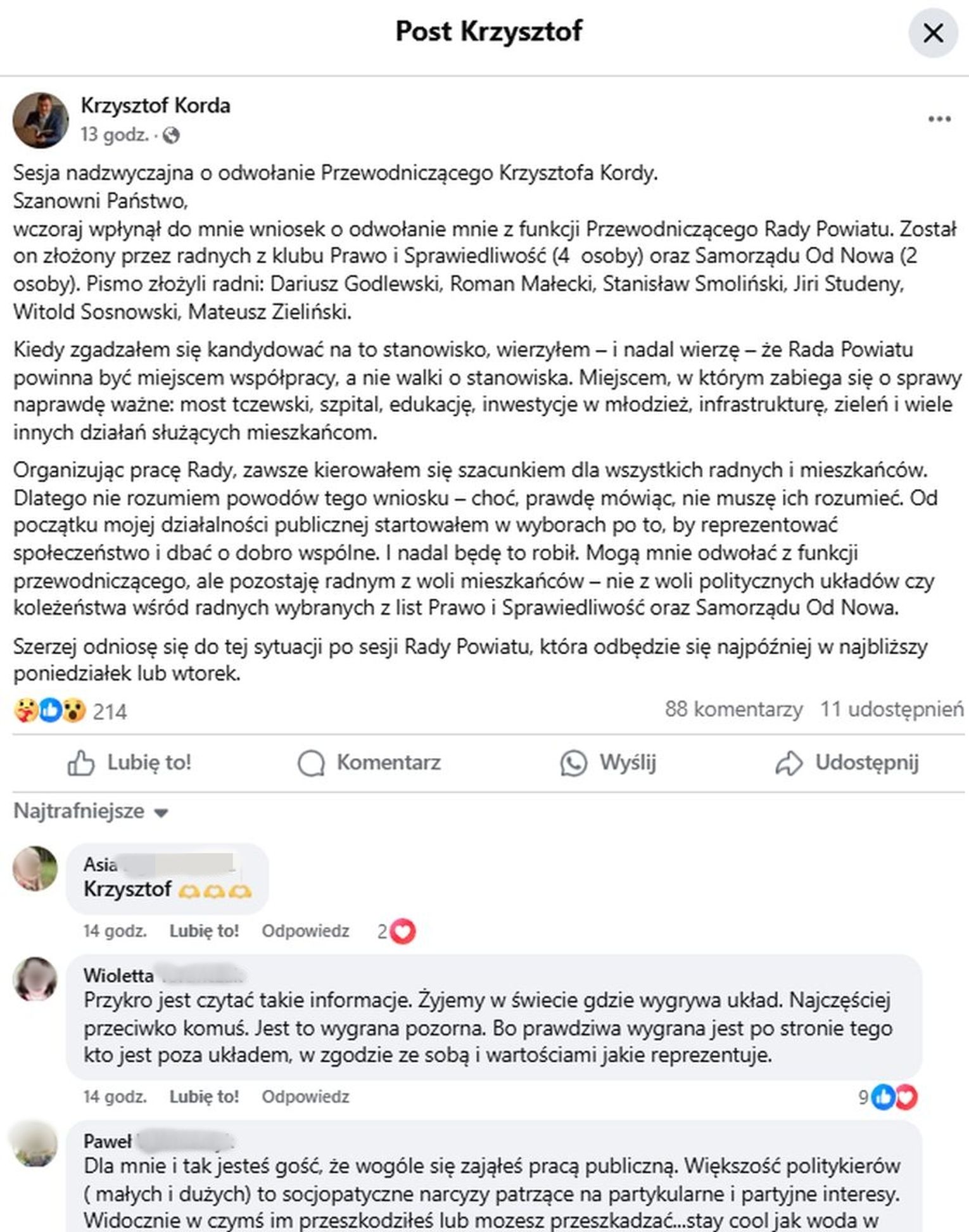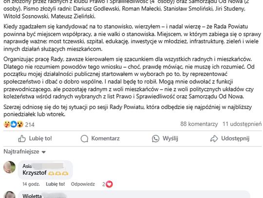 „Wczoraj (19 czerwca – dop. red.) wpłynął do mnie wniosek o odwołanie mnie z funkcji Przewodniczącego Rady Powiatu. Został on złożony przez radnych z klubu Prawo i Sprawiedliwość (4 osoby) oraz Samorządu Od Nowa (2 osoby). Pismo złożyli radni: Dariusz Godlewski, Roman Małecki, Stanisław Smoliński, Jiri Studeny, Witold Sosnowski, Mateusz Zieliński.