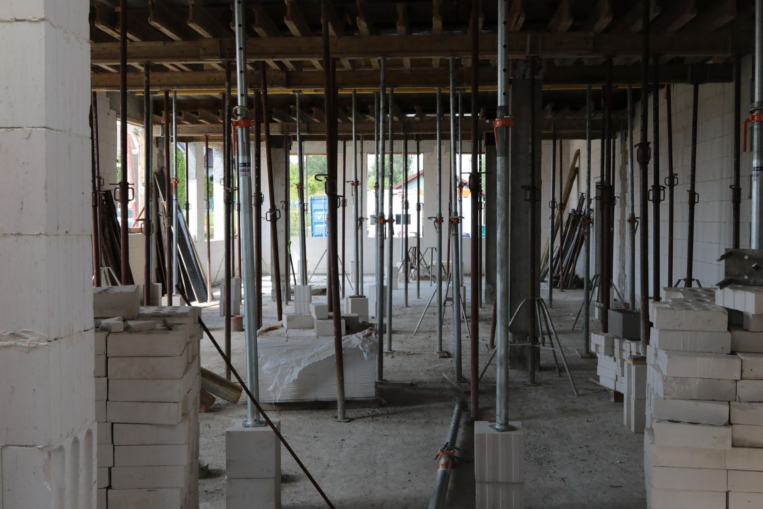 Stajemy na parterze budynku, pod stemplami, w pomieszczeniu przyszłej stołówki. Metalowe podpory podtrzymują zalany tydzień temu strop. Beton, w zależności od warunków (temperatura i wilgotność powietrza), będzie „dojrzewał” około miesiąca.