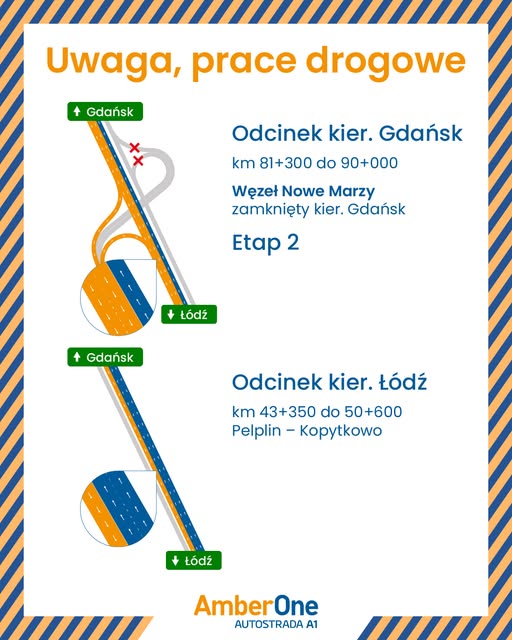 Równolegle trwają prace na odcinku km 81+300 do km 90+000 pomiędzy węzłami Warlubie – Nowe Marzy, gdzie remontowana jest jezdnia kier. Gdańsk, ruch odbywa się dwoma pasami w kier. Łódź i jednym pasem w kier. Gdańska. Węzeł Nowe Marzy pozostaje zamknięty kier. Gdańsk. To oznacza, że pojazdy jadące w kier. Gdańska nie mogą zjechać z autostrady na drogę ekspresową S5 ani na drogę krajową DK91 oraz że nie jest możliwy wjazd na autostradę kier. Gdańsk.