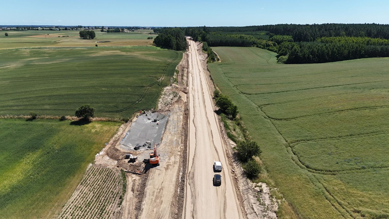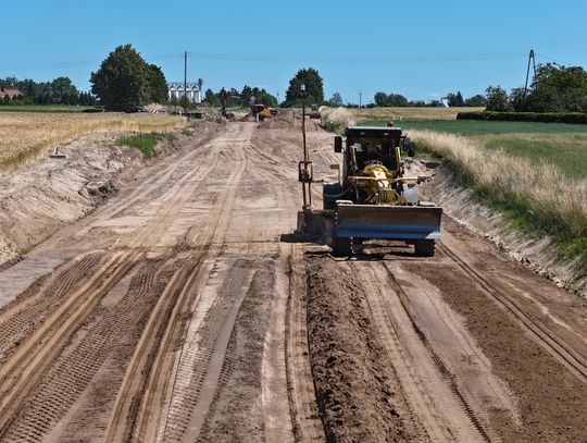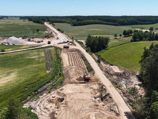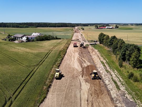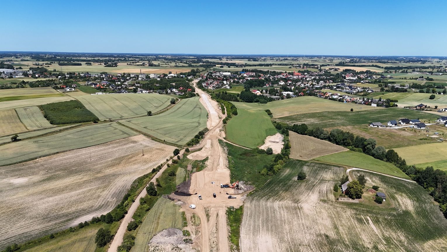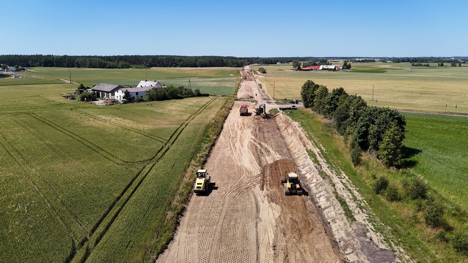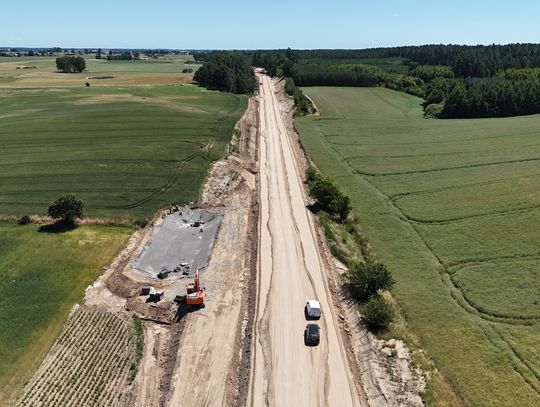 Wykonawca intensywnie pracuje na całym odcinku. Wykonywane są wykopy, nasypy oraz wzmacnianie podłoża, a na niektórych fragmentach rozpoczęto już budowę podbudowy pod warstwy bitumiczne. Trwa również budowa przepustów drogowych oraz kanalizacji deszczowej, która odwadnia nową trasę. Planowane zakończenie inwestycji to połowa 2026 roku.
