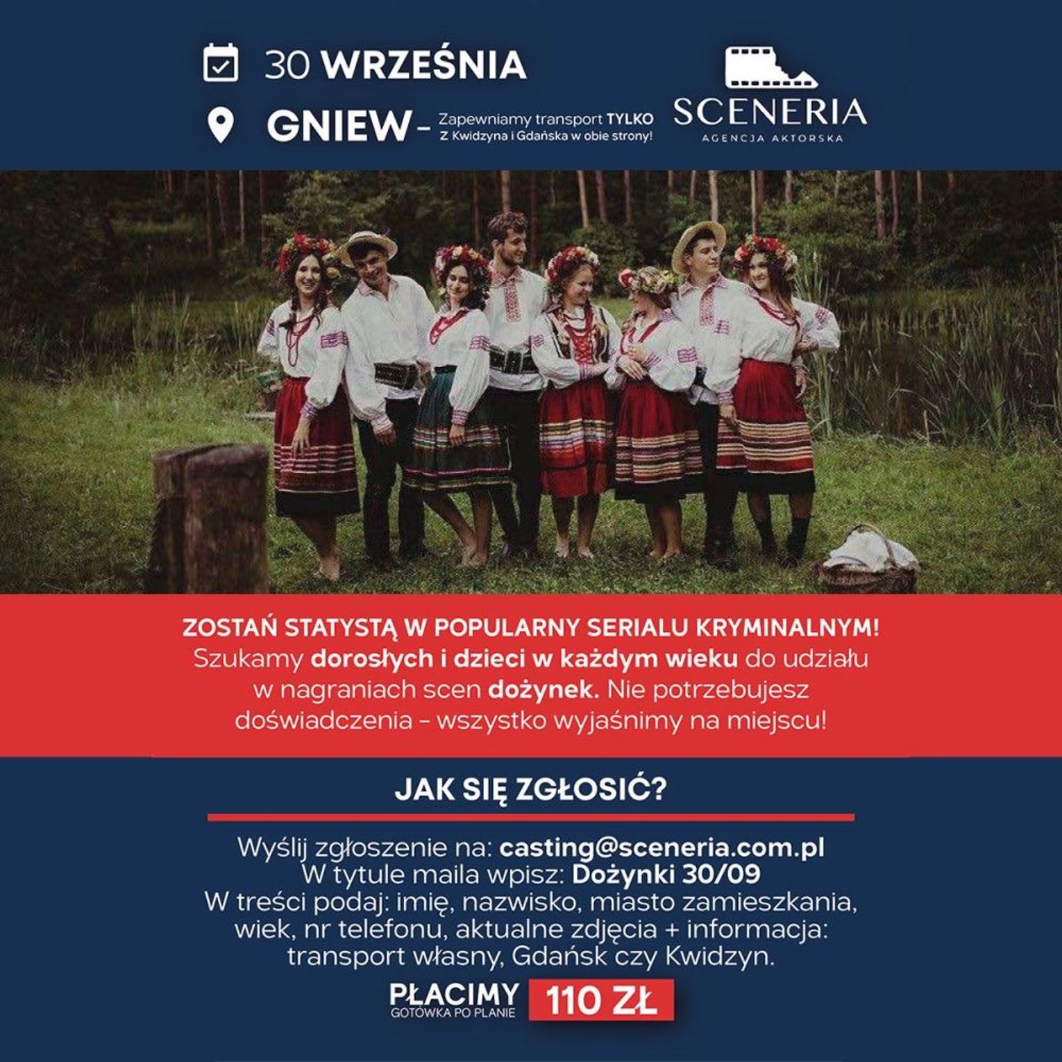 „Na potrzeby realizacji poszukujemy mieszkańców Gniewu – kobiet, mężczyzn i dzieci w różnym wieku – którzy mogliby wziąć udział w zdjęciach, jako statyści, w charakterze uczestników dożynek.