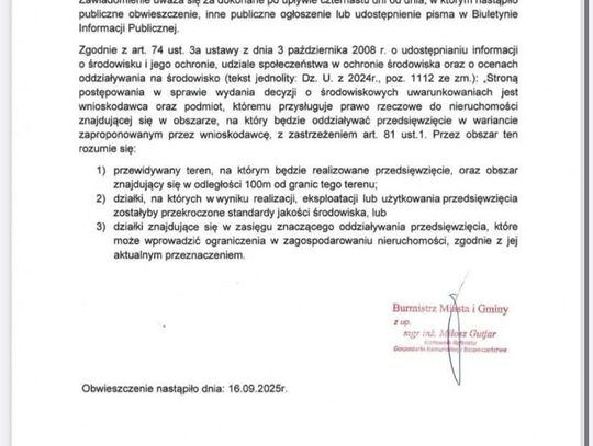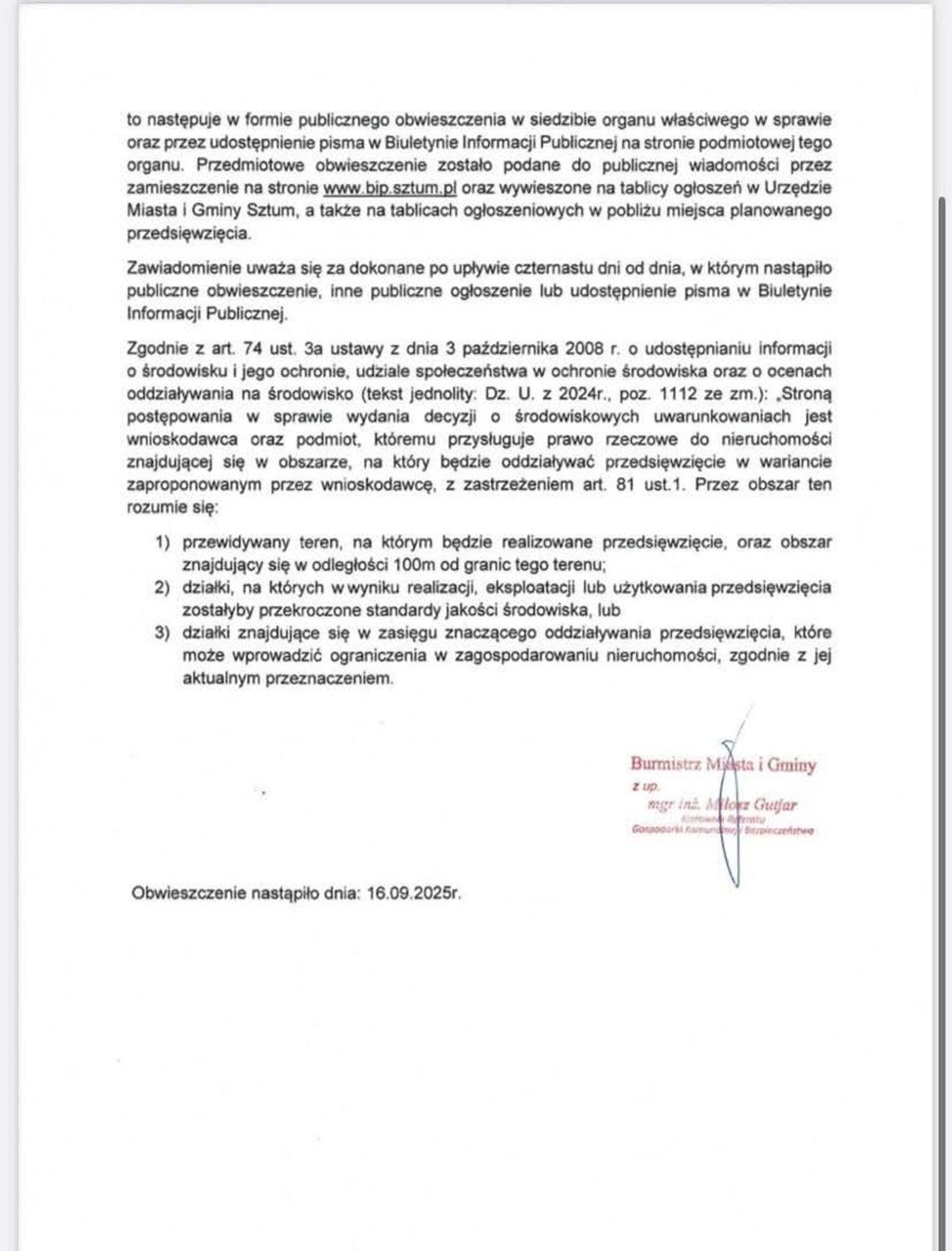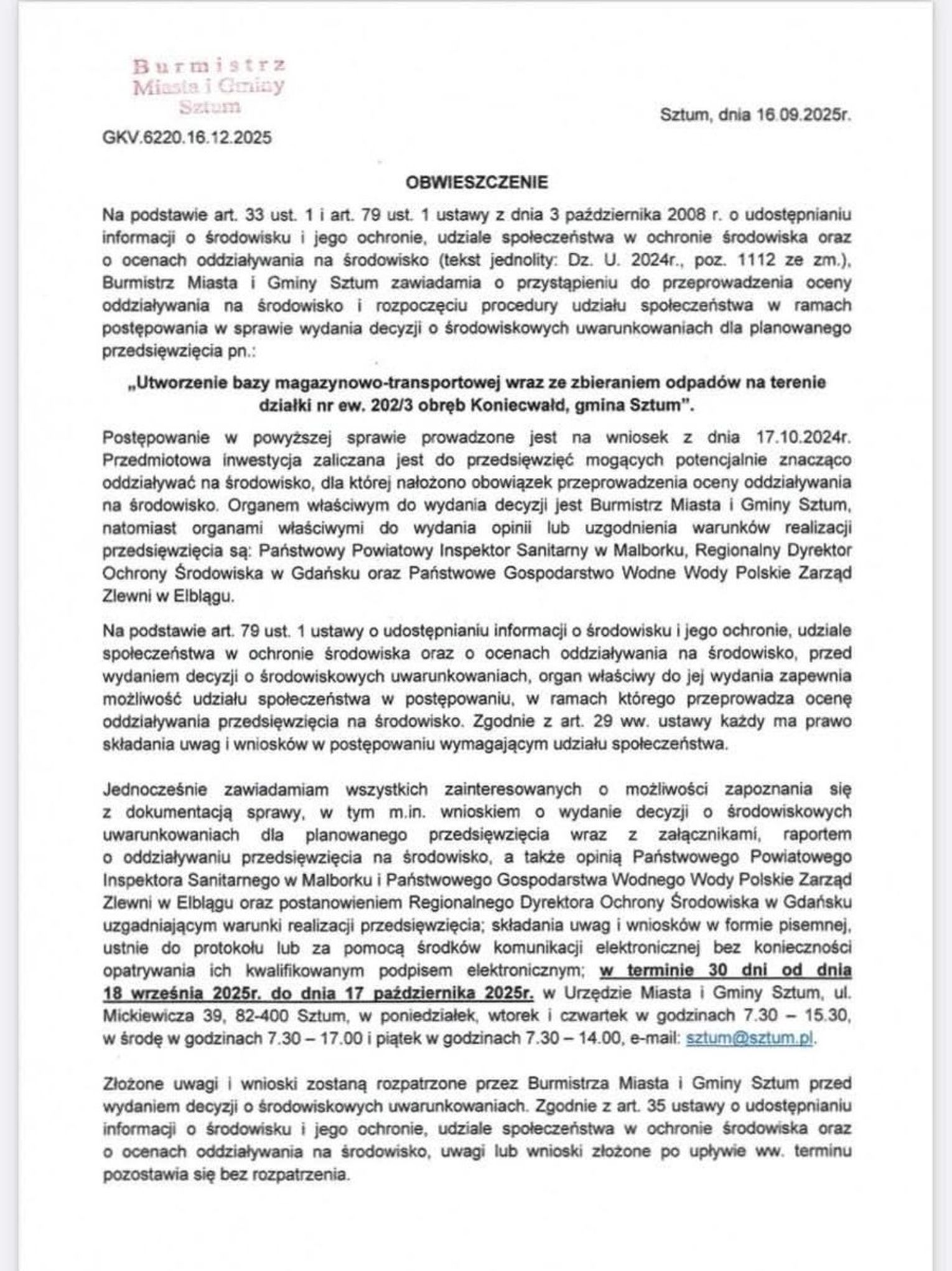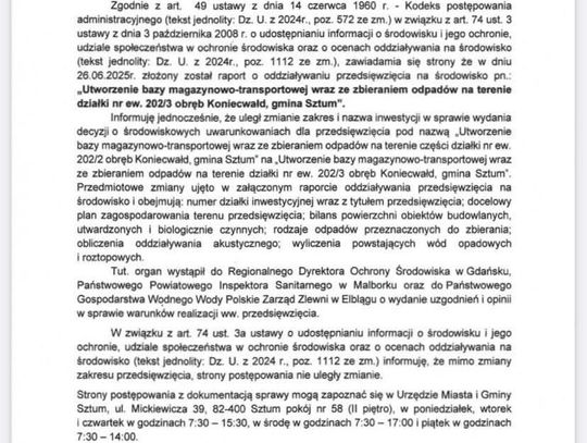 „(…) W obwieszczeniu datowanym na 16 września br. znajduje się informacja, że uległ zmianie zakres i nazwa inwestycji w sprawie wydania decyzji o środowiskowych uwarunkowaniach dla przedsięwzięcia pod nazwą "utworzenie bazy magazynowo transportowej wraz ze zbieraniem odpadów na terenie części działki nr ew. 202/2 obręb Koniecwałd, gm. Sztum" na - "utworzenie bazy magazynową transportowej wraz ze zbieraniem odpadów na terenie działki nr ew. 202/3 obręb Koniecwałd, gm. Sztum". Przedmiotowe zmiany ujęto w załączonym raporcie oddziaływania przedsięwzięcie na środowisko i obejmują numer działki inwestycyjnej wraz z tytułem przedsięwzięcia; docelowy plan zagospodarowania terenu przedsięwzięcia; bilans powierzchni obiektów budowlanych utwardzonych i biologicznie czynnych rodzaje odpadów przeznaczonych do zbierania obliczenia oddziaływania akustycznego; wyliczenia powstających wód odpadowych, wód, opadowych i roztopowych. (...)”.
