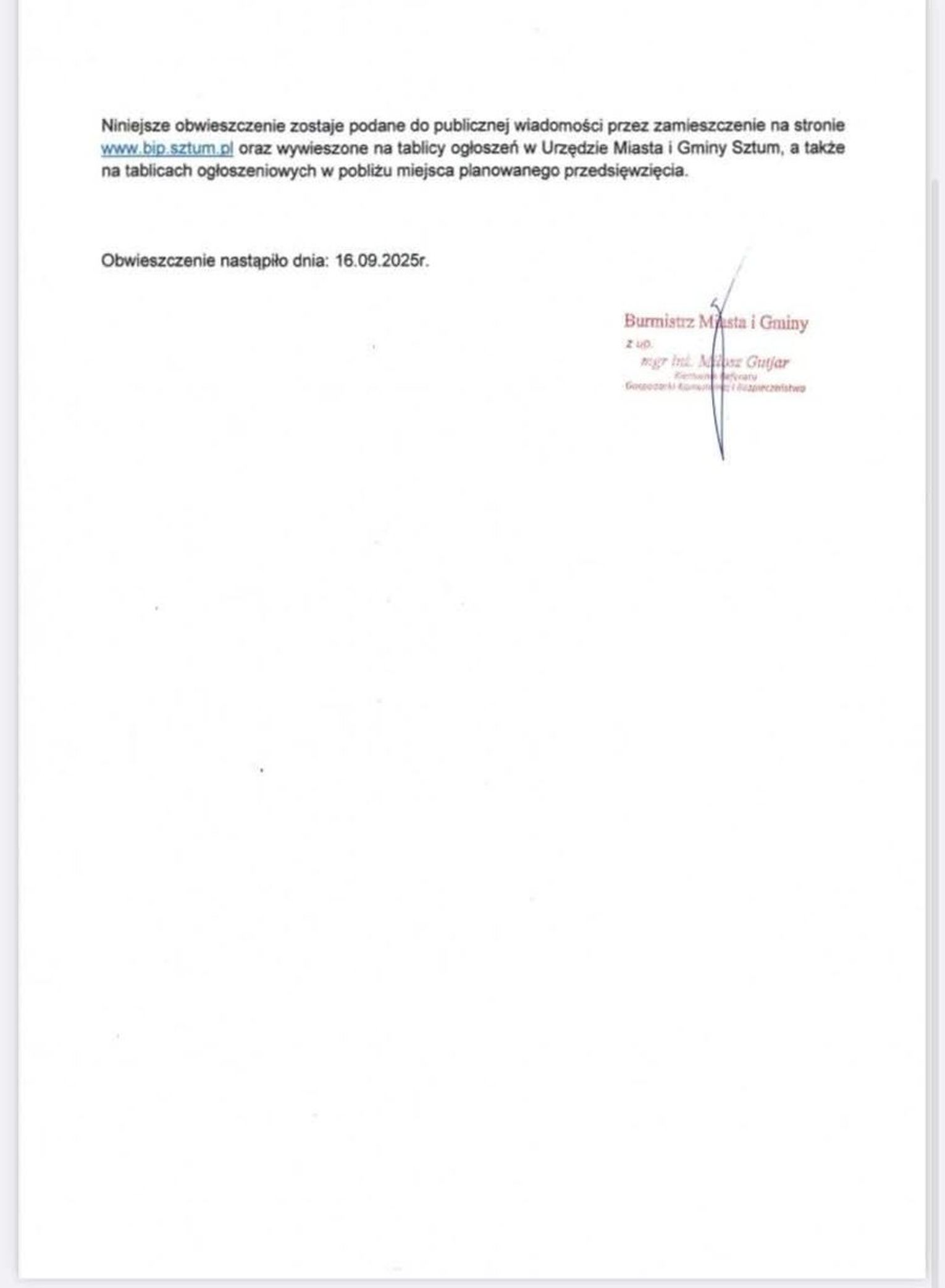 Celem tego obwieszczenia jest poinformowanie mieszkańców i umożliwienie im wyrażenia swojego zdania. Każdy z Państwa ma prawo zgłosić uwagi i wnioski ,osobiście w Urzędzie Miasta i Gminy Sztum lub mailowo na adres: [email protected] do dnia 17 października 2025 r.