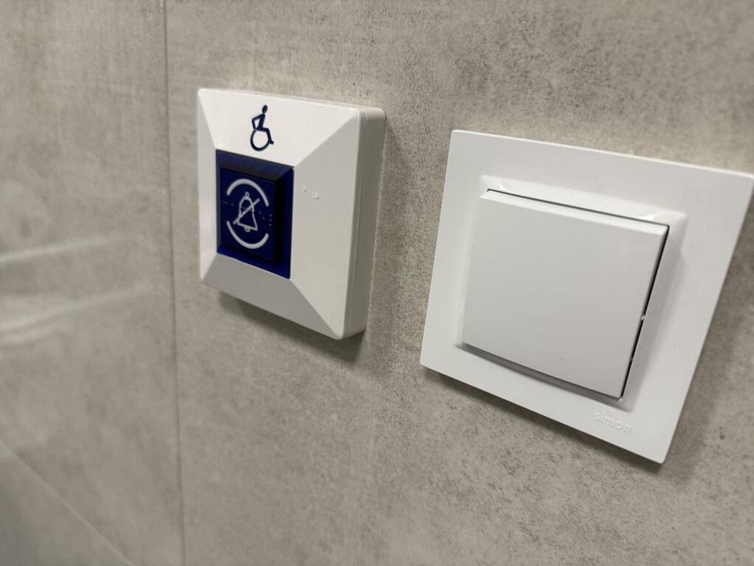 Toaleta została wykonana zgodnie z obowiązującymi wytycznymi i przepisami, określającymi m.in. odpowiednie wymiary, wysokość montażu urządzeń sanitarnych, niezbędną przestrzeń manewrową oraz wyposażenie – w tym stabilne uchwyty, dzwonek alarmowy i antypoślizgową podłogę.