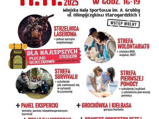 Dużo informacji, dużo ciekawostek, możliwość udziału w szkoleniu pierwszej pomocy i sprawdzenia się na strzelnicy. Oczywiście wspólne świętowanie rozpocznie tradycyjna grochówka dla wszystkich! Do wygrania będą atrakcyjne nagrody, m.in. dla najlepszych strzelców Stowarzyszenie przygotowało plecaki ewakuacyjne z wyposażeniem ! Niech ten dzień będzie symbolem jedności, wspólnoty i dumy z biało-czerwonych barw. Spotkajmy się, by razem poczuć, jak smakuje wolność!