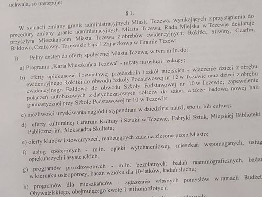 - Miasto Tczew chce się poszerzyć kosztem gminy wiejskiej. No i raczej będą dymy – komentuje Michał Kargul na swoim profilu FB. - Choćby dlatego, że oferta miasta jest bardziej niż skromna - de facto sprowadza się do oferty remontu kilku dróg (plus profity, które po prostu wynikają z faktu bycia mieszkańcem miast). Władze gminy, ale pewnie i spora część mieszkańców terenów, które miałyby być włączone, raczej nie będą tu tryskać entuzjazmem. A i w kilku miejscach miasto ewidentnie chce zgarnąć jedynie atrakcyjne kąski, co pewnie da mocny oręż do ręki obrońcom status quo.