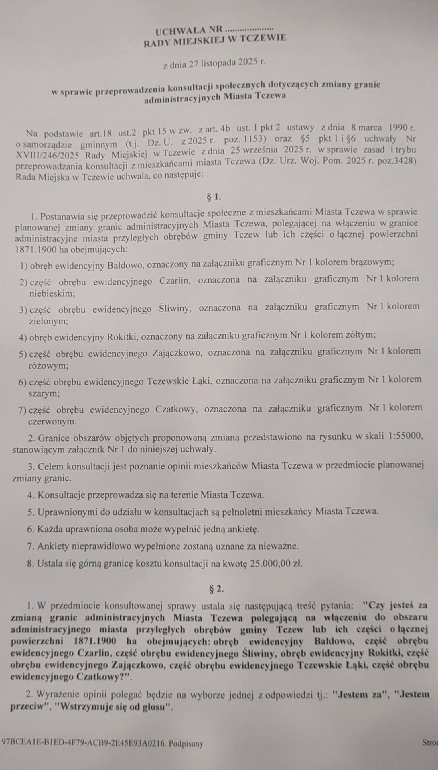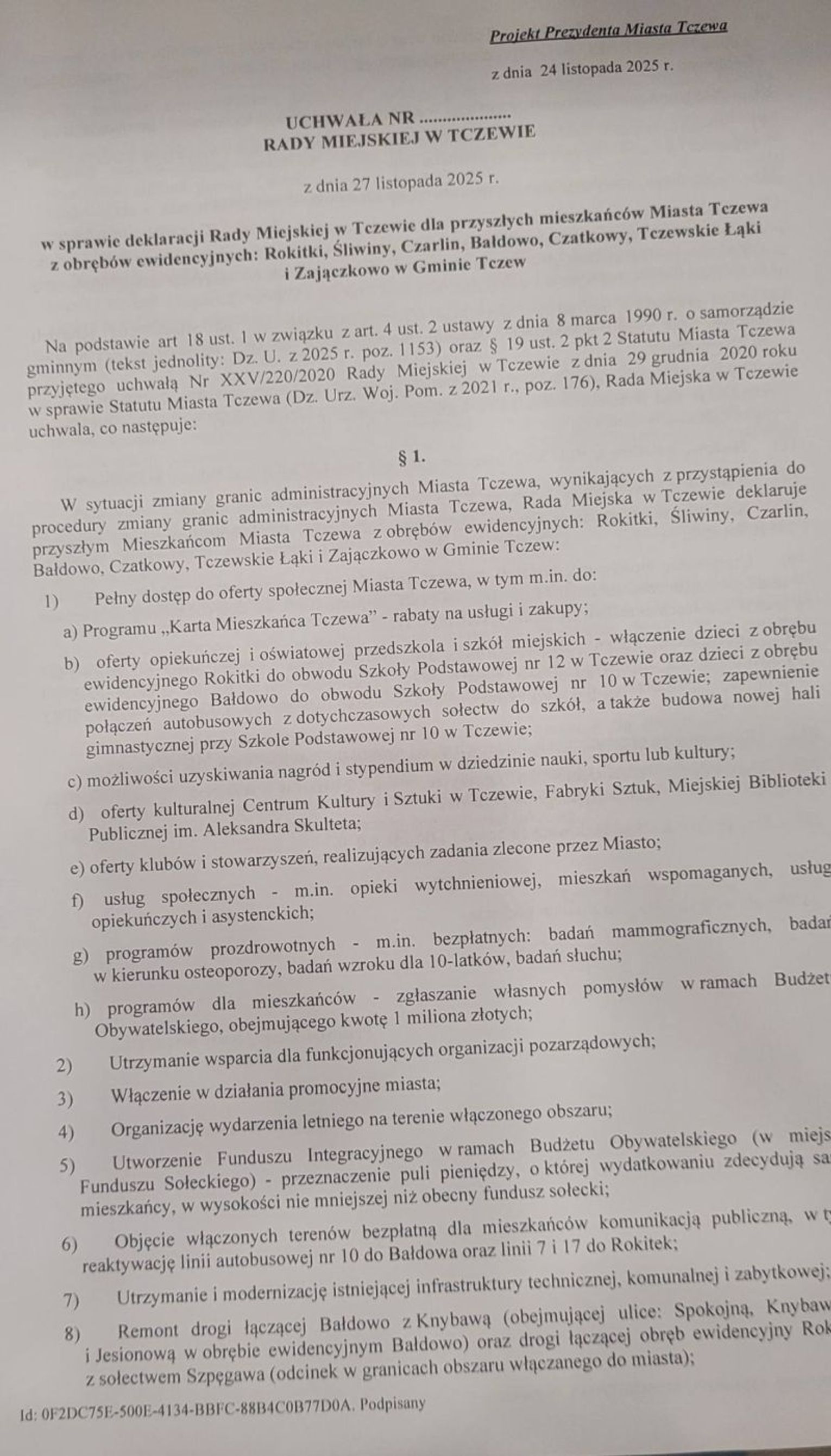 Po drugie: Projekt uchwały w sprawie deklaracji Rady Miejskiej w Tczewie dla przyszłych mieszkańców Miasta Tczewa z obrębów ewidencyjnych oznaczonych na poniższej mapie ✅️