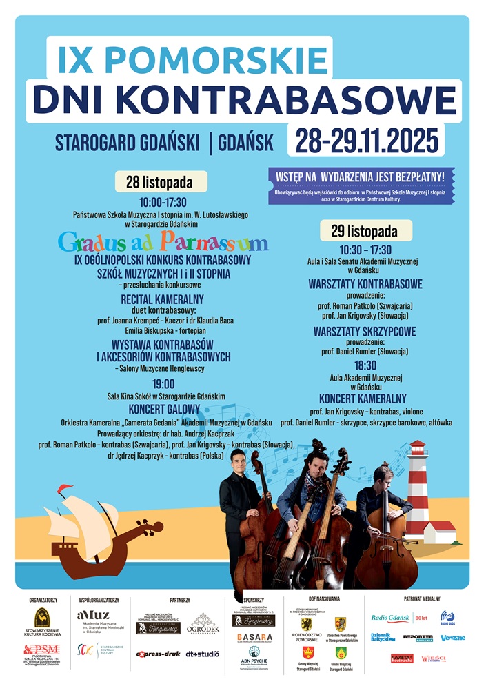 Wstęp na wszystkie wydarzenia w ramach IX Pomorskich Dni Kontrabasowych jest bezpłatny! Wejściówki można odebrać w Państwowej Szkole Muzycznej I stopnia w Starogardzie Gdańskim, Starogardzkim Centrum Kultury oraz w biurze promocji Akademii Muzycznej w Gdańsku.
