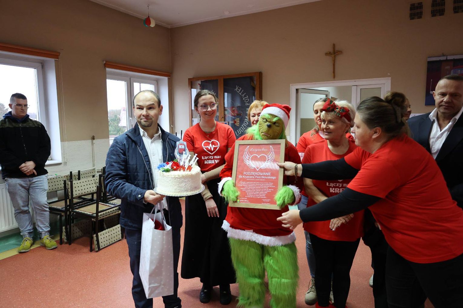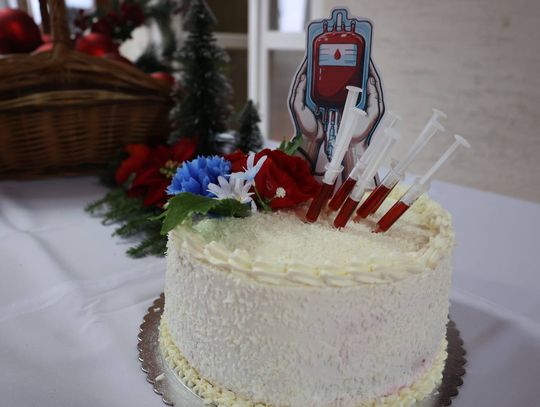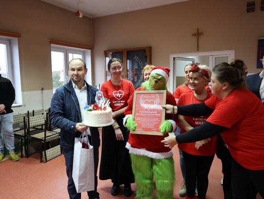 Jubileusz był również okazją do podziękowań dla organizatora. Gratulacje Krystianowi Piotrzkowskiemu złożył m.in. wójt gminy Artur Herold, a wolontariuszki wręczyły mu symboliczny tort jako wyraz wdzięczności. Co szczególnie poruszające, wolontariuszkami były osoby, którym krew uratowała zdrowie lub życie.