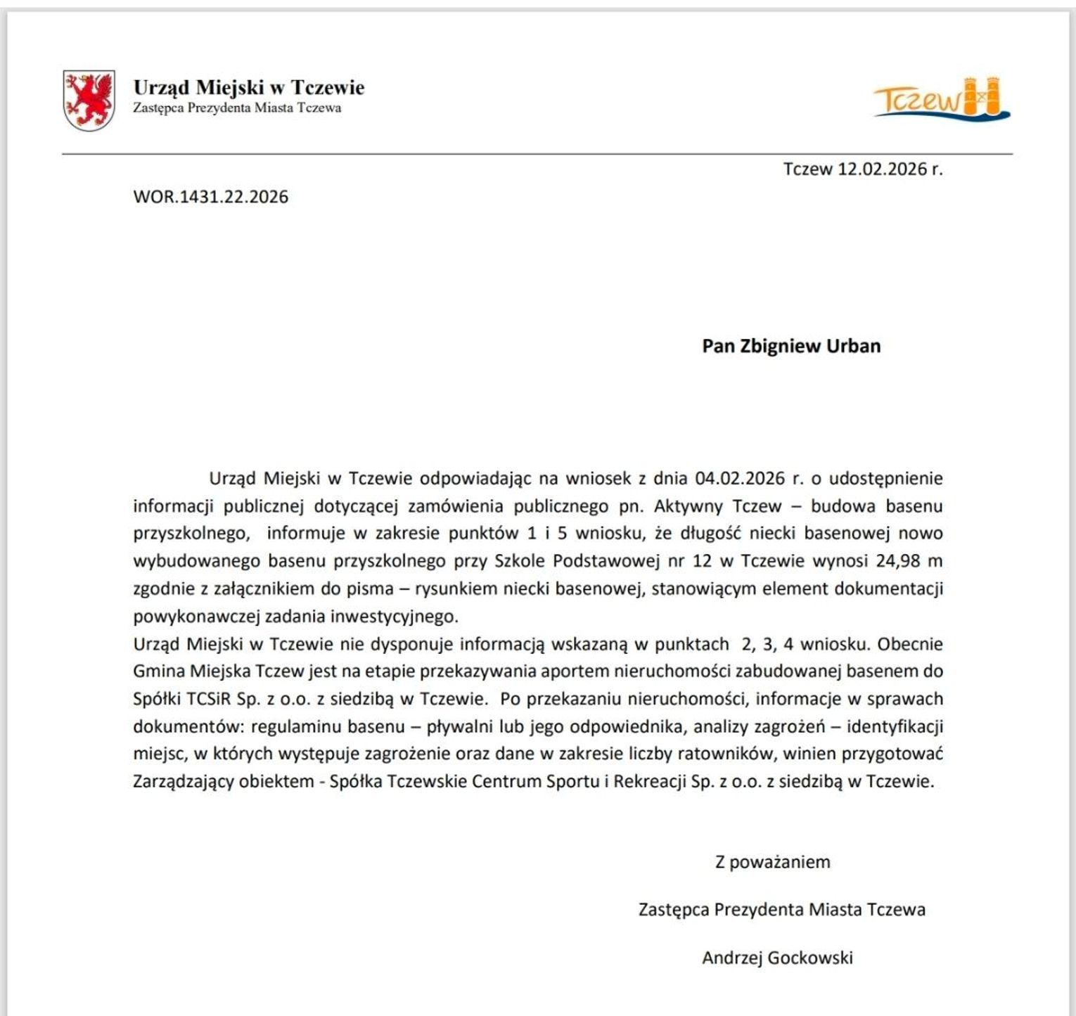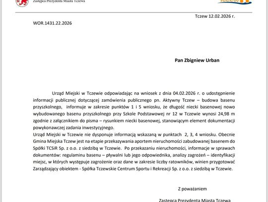 „Z dnia 04.02.2026 r. o udostępnienie Urząd Miejski w Tczewie odpowiadając na wniosek informacji publicznej dotyczącej zamówienia publicznego pn. Aktywny Tczew budowa basen przyszkolnego, informuje w zakresie punktów 1 i 5 wniosku, że długość niecki basenowej nowo wybudowanego basenu przyszkolnego przy Szkole Podstawowej nr 12 w Tczewie wynosi 24,98 m zgodnie z załącznikiem do pisma rysunkiem niecki basenowej, stanowiącym element dokumentacji powykonawczej zadania inwestycyjnego. Urząd Miejski w Tczewie nie dysponuje informacją wskazaną w punktach 2, 3,4 wniosku. Obecnie Gmina Miejska Tczew jest na etapie przekazywania aportem nieruchomości zabudowanej basenem do Spółki TCSIR Sp. z o.o. z siedzibą w Tczewie.